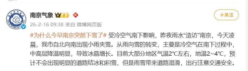另据江苏气象,雪真的来了!目前江苏南部部分地区已出现雨夹雪或雪,南京北极阁山上也开始飘雪啦!路面湿滑出行请注意安全。实时气温较低,仅2-4℃左右,体感寒冷,记得添衣保暖哦!预计今天白天到夜里,沿江和苏南地区阴有小雨或雨夹雪并渐止转阴到多云,其中本省西南部地区有短时小雪,其他地区阴到多云。来源 | 扬子晚报综合南京气象、江苏气象、中央气象台、网友评论等扬子晚报微信为大家送上新春福利!
