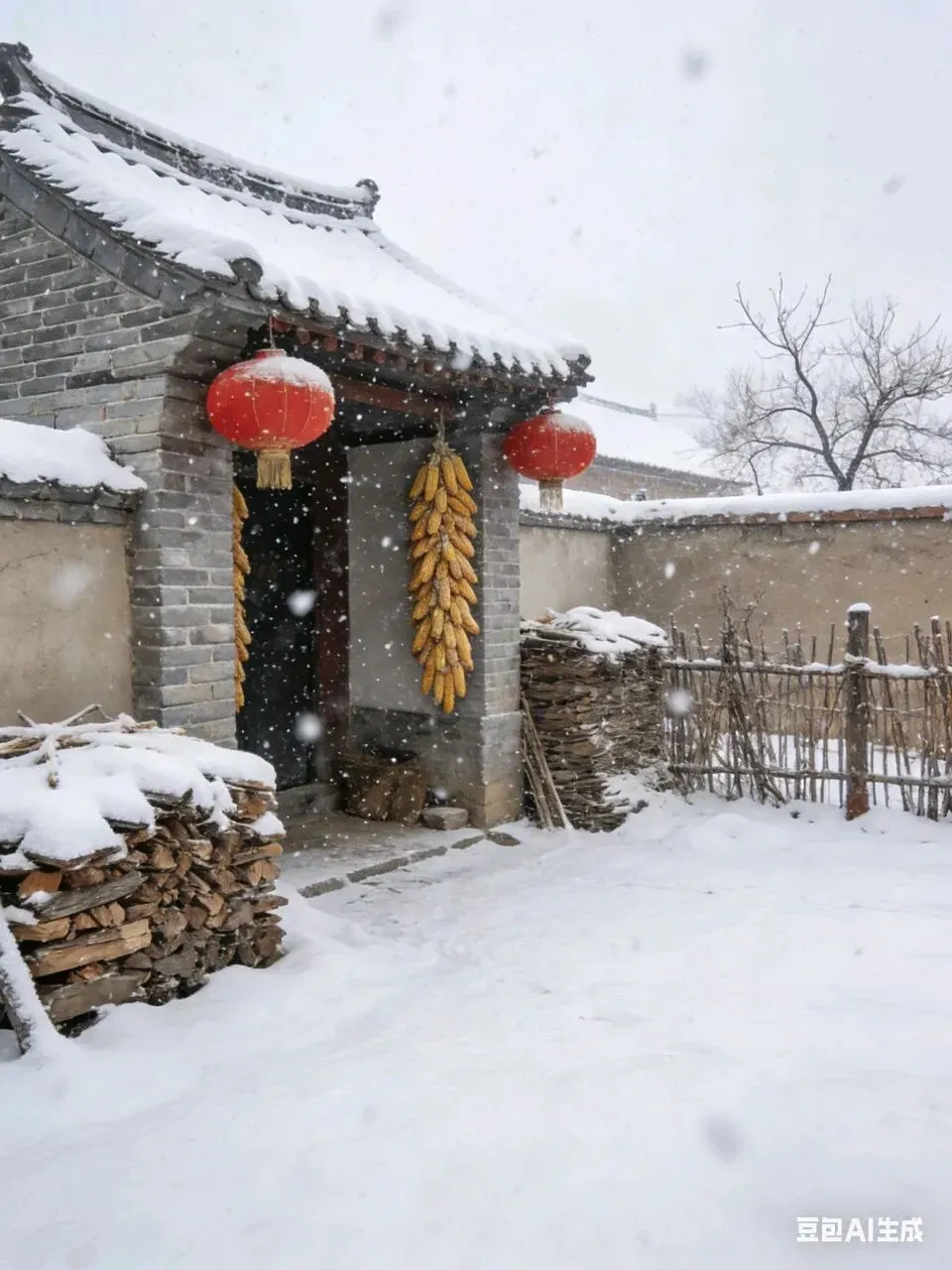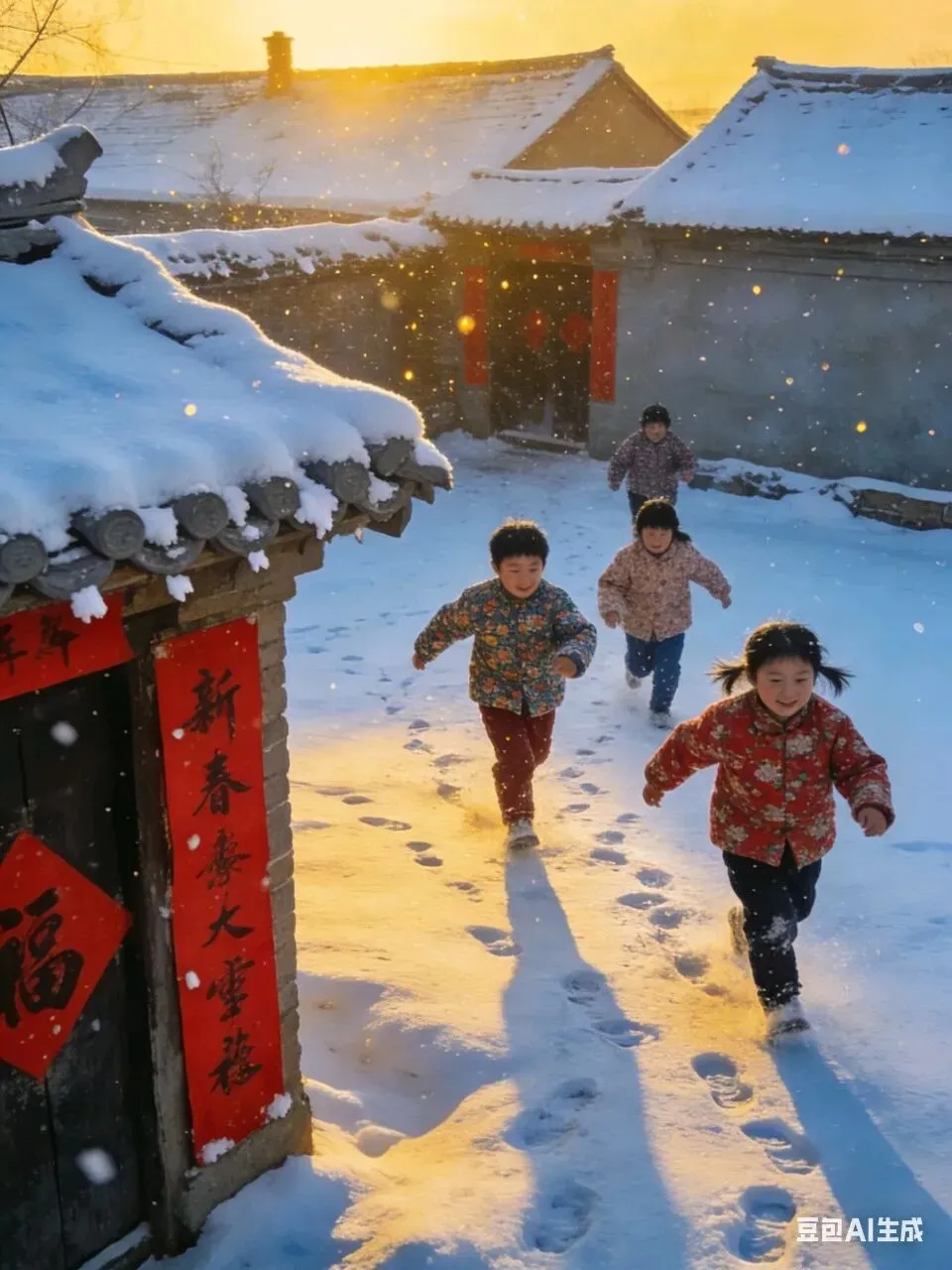 雪把院子里的红对联、灰瓦片都盖住了,干干净净,像一张崭新的画。我们顾不上冷,冲进雪里,要踩出第一串脚印。