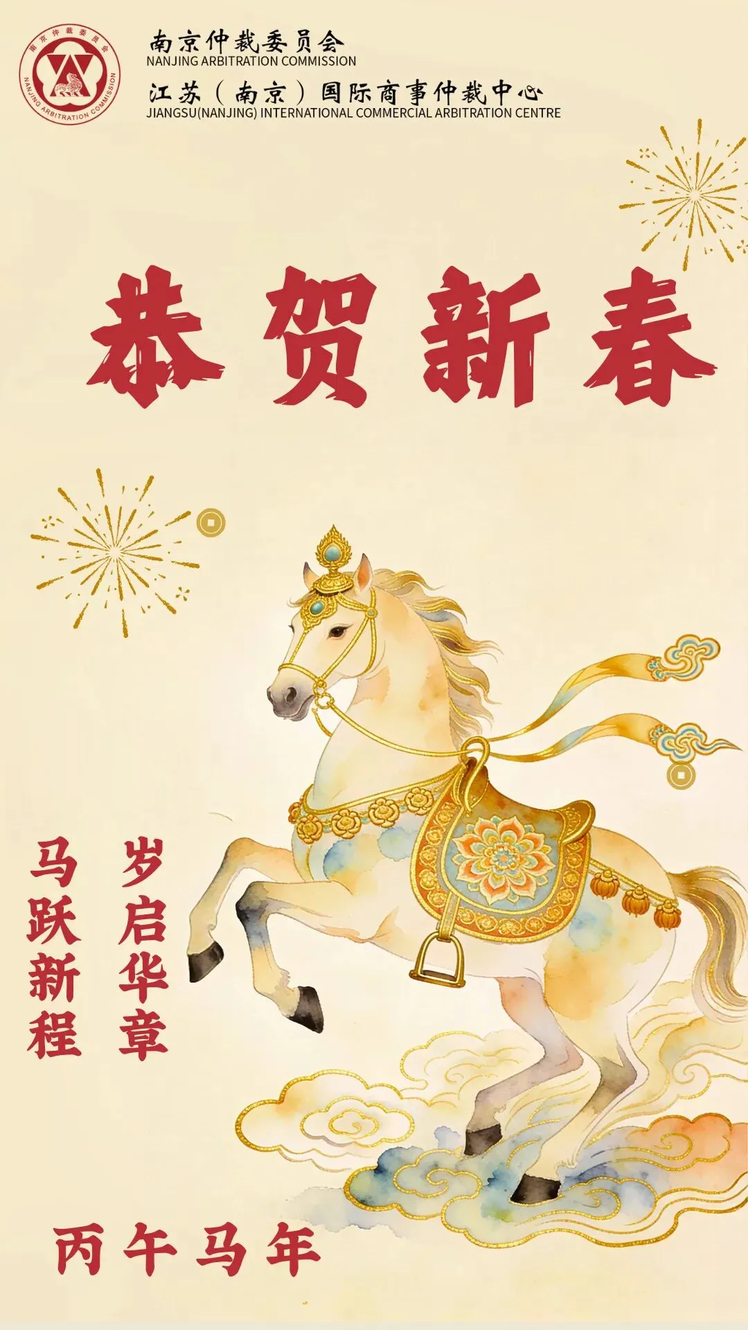 值此丙午马年新春佳节,南京仲裁委员会/江苏(南京)国际商事仲裁中心向长期以来关心支持仲裁事业发展的各级领导、各位仲裁员、各界同仁及广大市民,致以热烈的节日祝贺和诚挚的新春祝福!