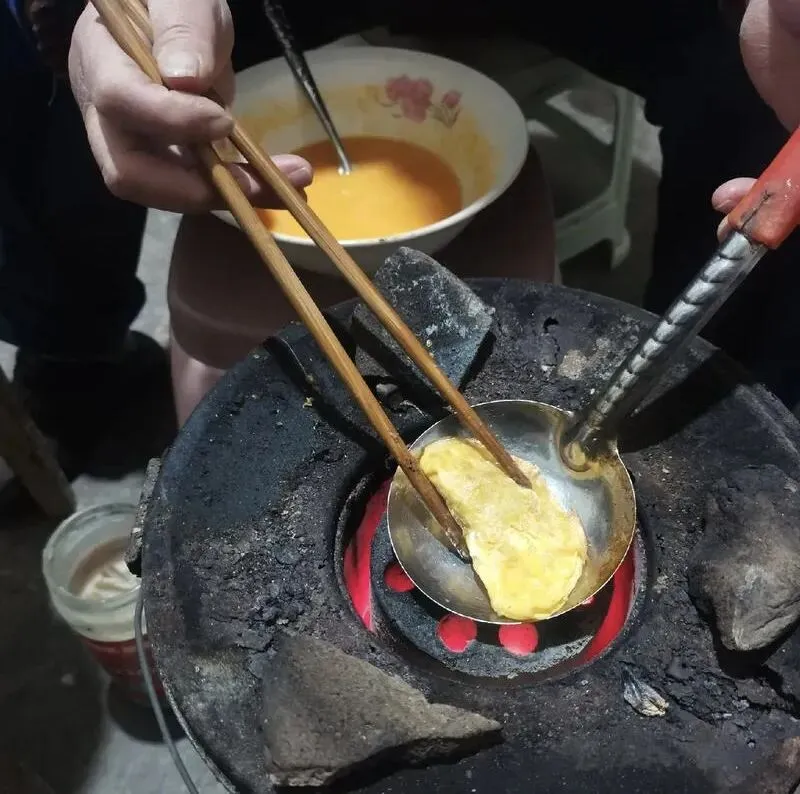一把黑铁勺,一块猪油膘,金黄的蛋液淋下去,“滋啦”一声轻响中旋转出一张圆润的皮,包上肉馅,对折合拢,便是一只圆满的金元宝。