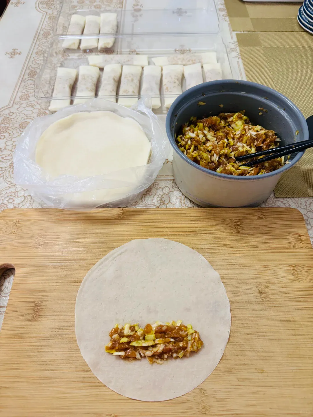 炸春卷是年夜饭桌上的“小惊喜”,每年除夕下午,家里就会围在一起包春卷。