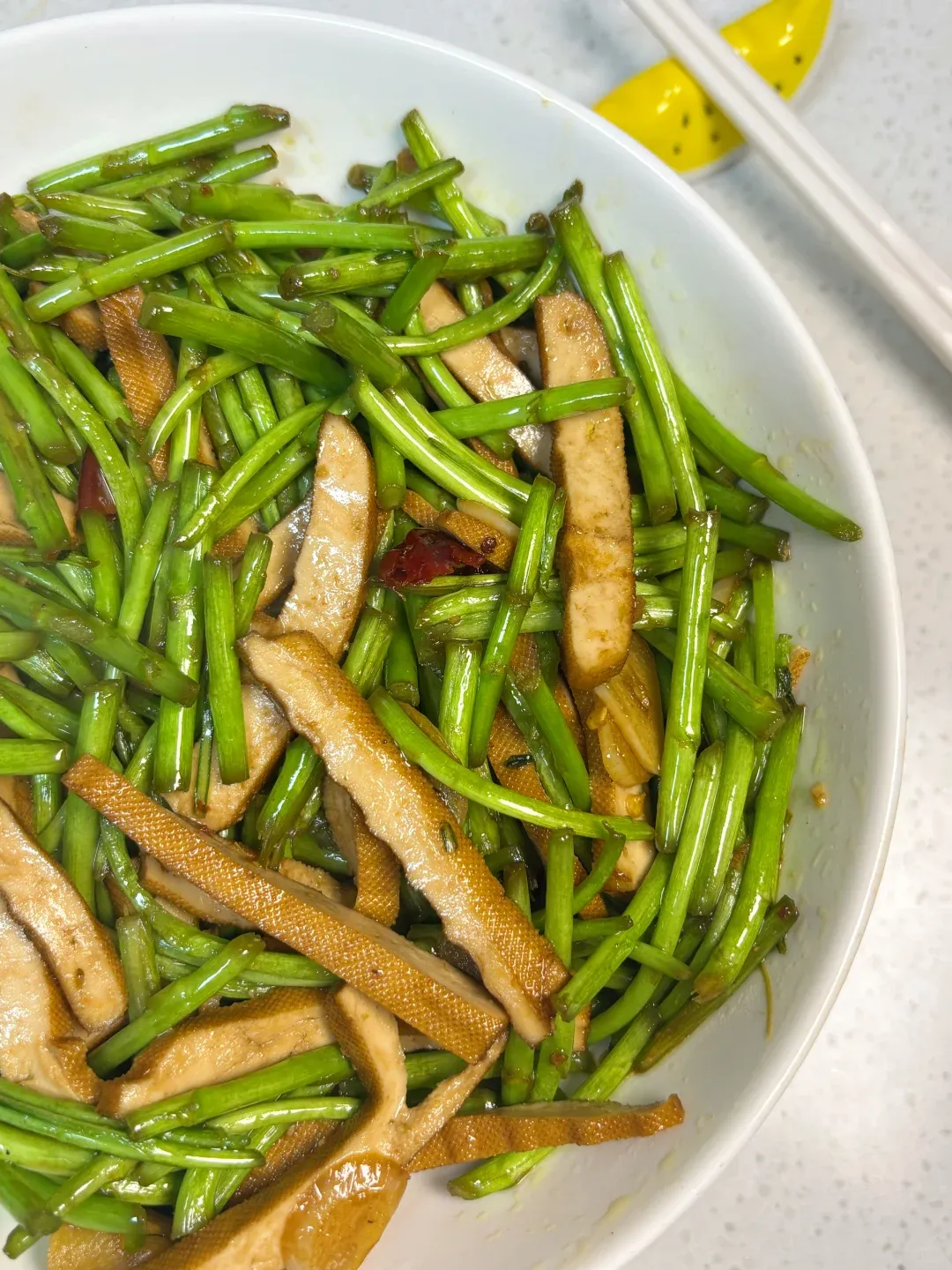 鲜嫩的芦蒿去叶留茎,切成小段,和香干一起清炒,不用复杂调料,只加少许油和盐,翻炒几下就出锅。