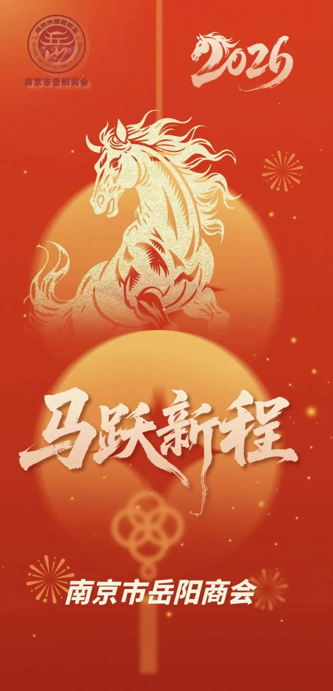 值此2026年除夕佳节、万家团圆之际,南京市岳阳商会谨向长期以来关心、指导商会建设的各级领导,向鼎力支持商会发展的社会各界友人,向心系家乡、携手同行的全体在宁乡友,以及商会全体会员及家人,致以最诚挚的新春祝福和最美好的节日问候!