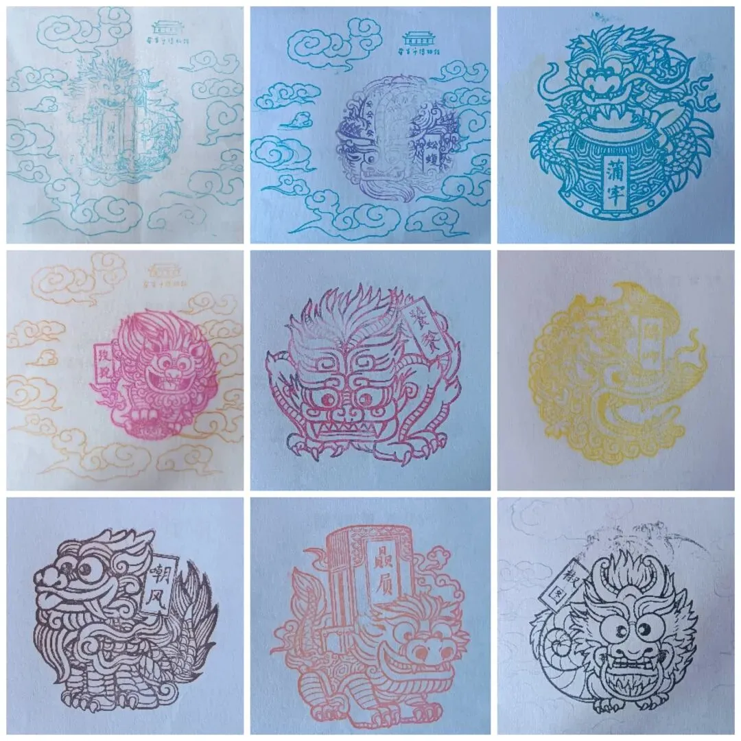 我们第一次来的时候没带打卡本,只好随便盖在散纸上,那一次的印章是龙生九子系列,每一个图案,都是馆内相关文物的精致细节。