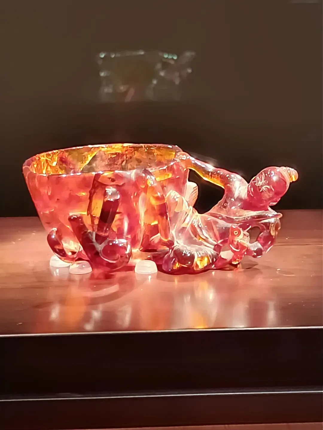 其中,那只通红透亮的渔翁戏荷琥珀杯,至今仍让我记忆犹新。杯子由整块深红色血珀雕琢而成,以一片卷曲的荷叶为杯身,荷叶下的水草缠绕成底托,荷叶边,一位渔翁探出头来,左手紧紧攥着一尾跃动的鱼儿,一动一静间,巧思尽显,趣味盎然。
