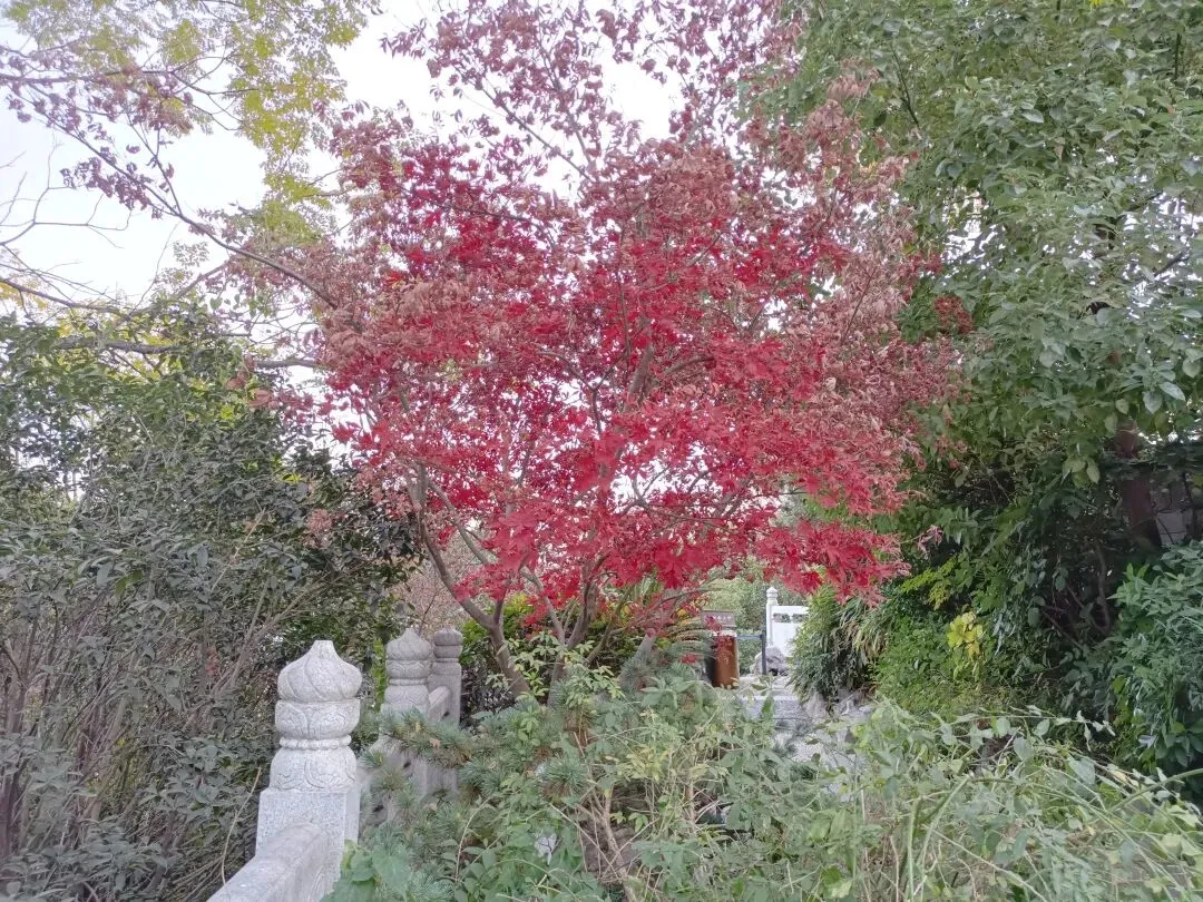 逛完展馆往后走,便到了后院的小园林,这里别有一番江南雅趣。小池静谧无波,石拱桥斜跨水面,亭台的飞檐弯弯绕绕,几株红枫立于其间。