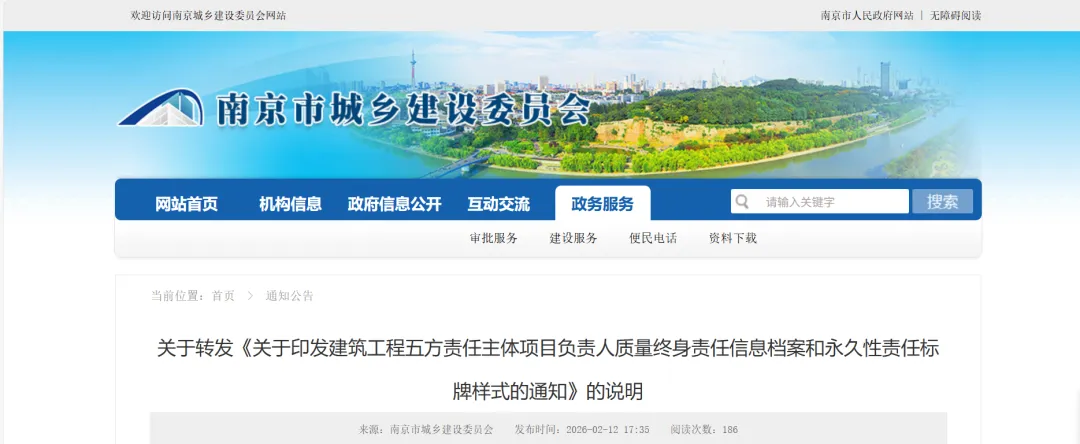 近日,省住建厅发布了《关于印发建筑工程五方责任主体项目负责人质量终身责任信息档案和永久性责任标牌样式的通知》(苏建规字〔2026〕7号),为进一步做好贯彻落实,现将相关工作要求通知如下: