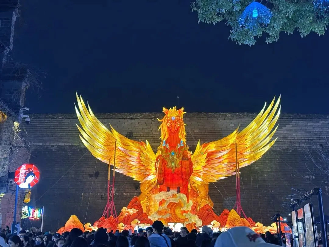 这匹名为“赤焰神骏耀金陵”的飞马,其实是老门东连续12年打造巨型生肖灯的一次“集大成”——至此,十二生肖主题灯彩首次集齐。它的设计理念很“南京”:既有传统生肖文化的厚重,又有突破传统的创新。