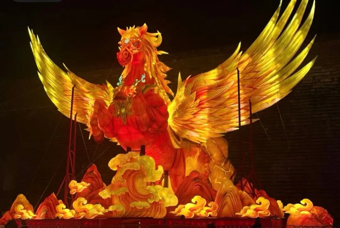 15米高、28米宽,橙黄色的巨翼在夜风中仿佛真的在扇动,腾空的双蹄让人想起“天马行空”四个字。周围的人群发出阵阵惊呼,小朋友骑在爸爸肩上,仰着小脸看得入神。