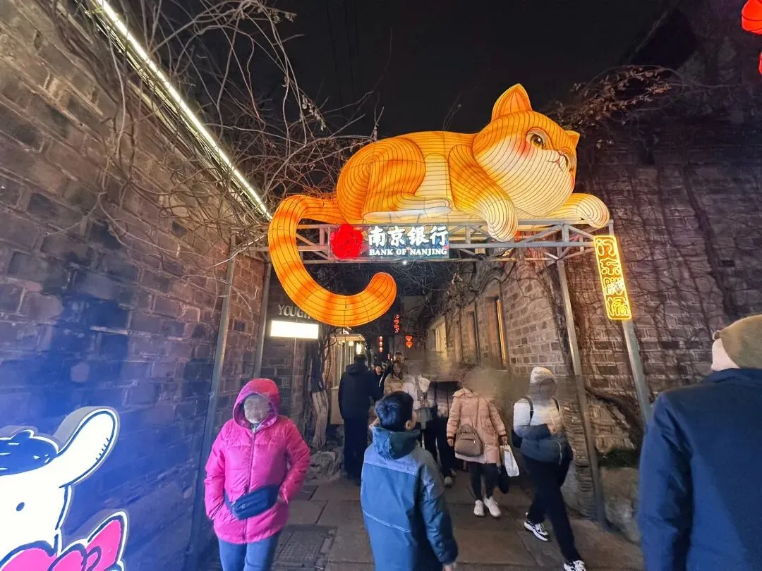 抬头一看,一只圆滚滚的橘猫灯正蜷卧在屋檐下,暖橙色的灯光柔和地洒下来。儿子跑去摸猫尾巴——那是隐藏的开关,猫眼竟然缓缓眨动,还发出“喵”的一声。旁边穿汉服的姑娘们排队拍照,小朋友们反复触碰开关,笑得合不拢嘴。