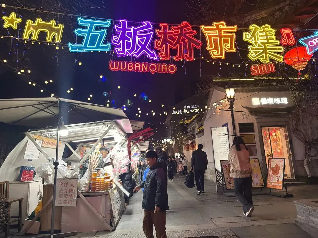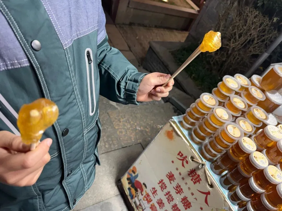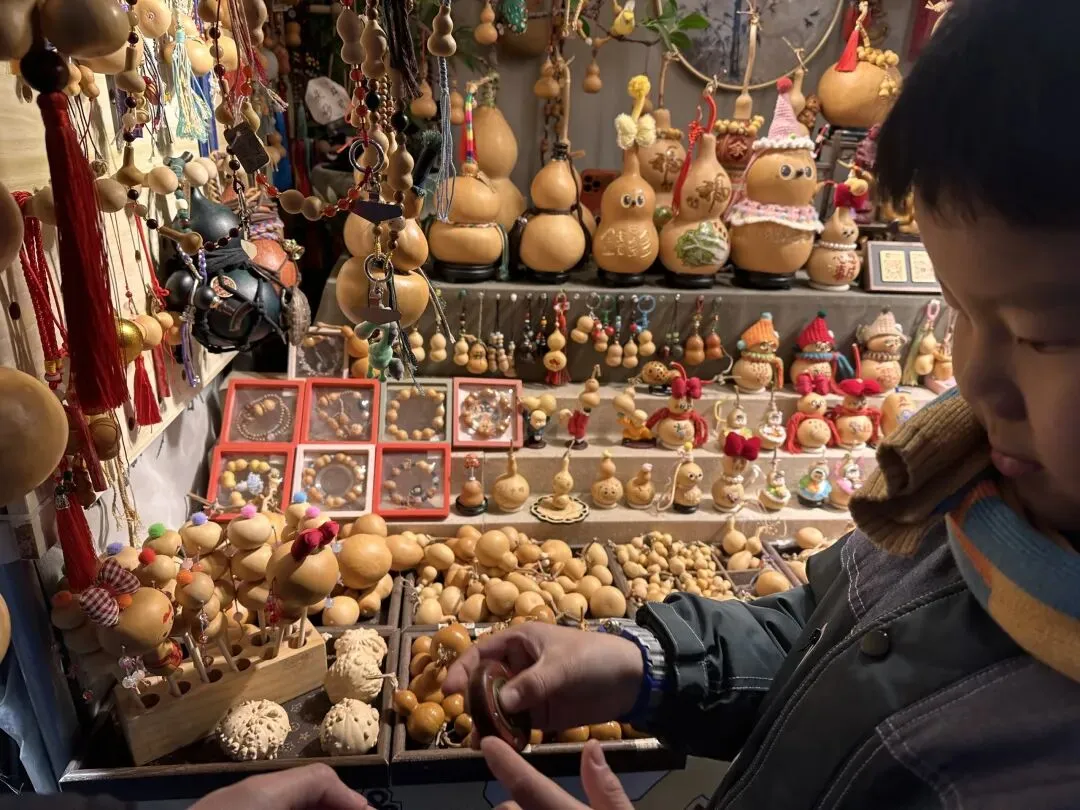 老门东的小吃摊也很多丰富,吹糖人、蒸儿糕、云片糕...梅花糕在游客的嘴巴里烫得直吹气,但排队的人最多!穿过五板桥市集时,手工艺品琳琅满目,小福淘到了喜欢的小物件,一路提在手里,蹦蹦跳跳。