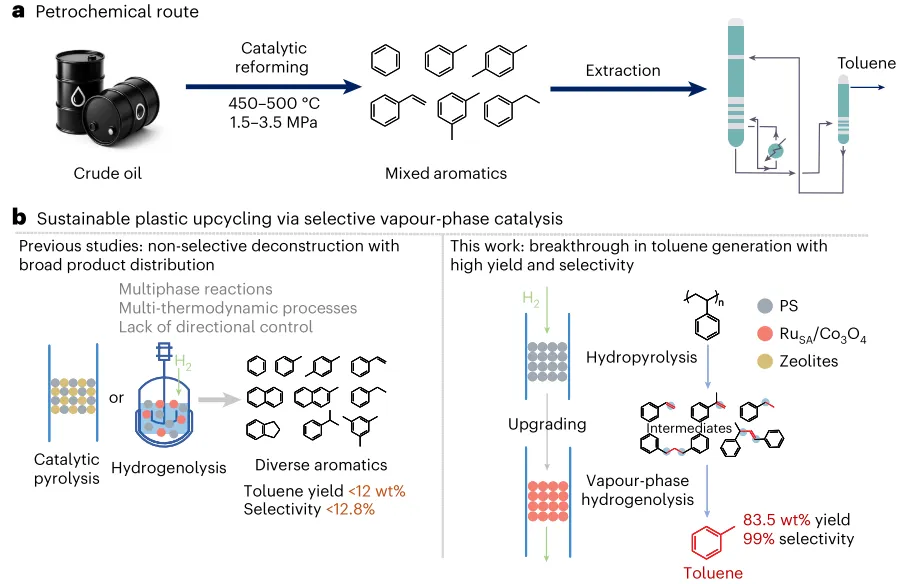图1 从原油和 PS 废物中生产甲苯的途径。