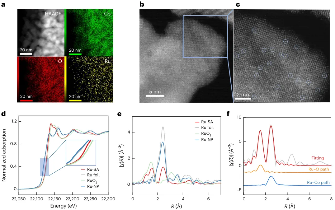 扩展X射线吸收精细结构分析:拟合显示Ru–O配位数约5,Ru–Co配位约9,说明Ru嵌入Co₃O₄晶格中,与Co空位相邻。
