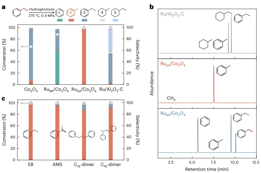 Ru₅ₐ/Co₃O₄:苯乙烯完全转化,甲苯选择性>99%,产物单一。