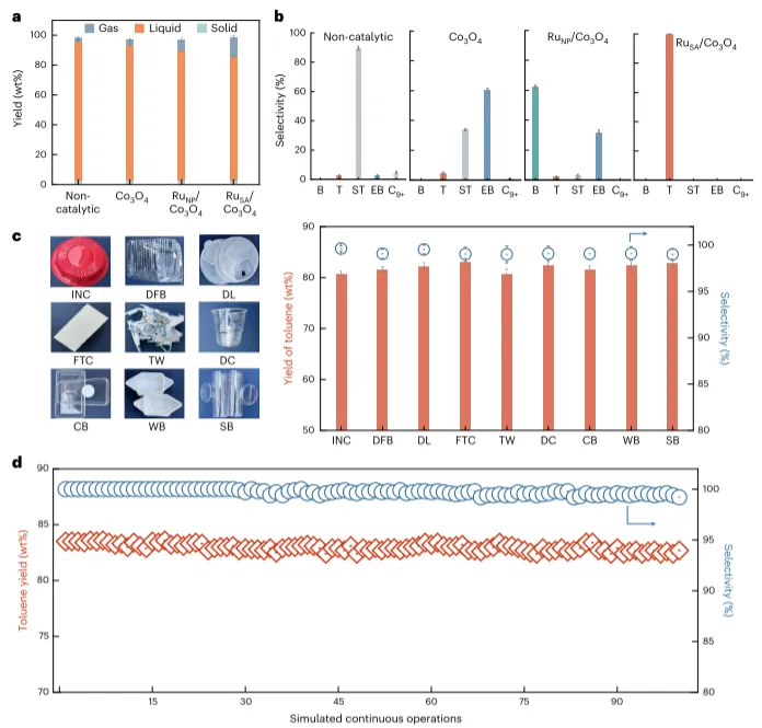 结果:甲苯产率83.5 wt%,选择性>99%,且适用于多种真实PS废弃物(食品盒、泡沫箱等)。