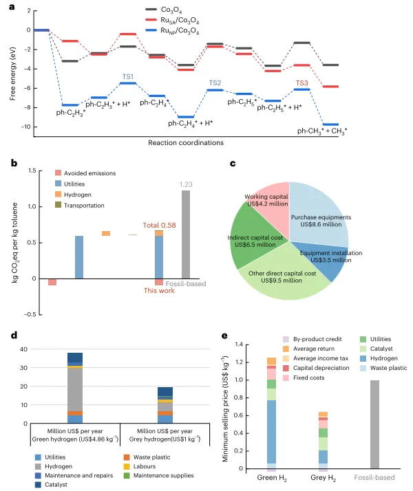 图5 利用 PS 废物可持续生产甲苯的 DFT 机理研究、LCA 和 TEA。