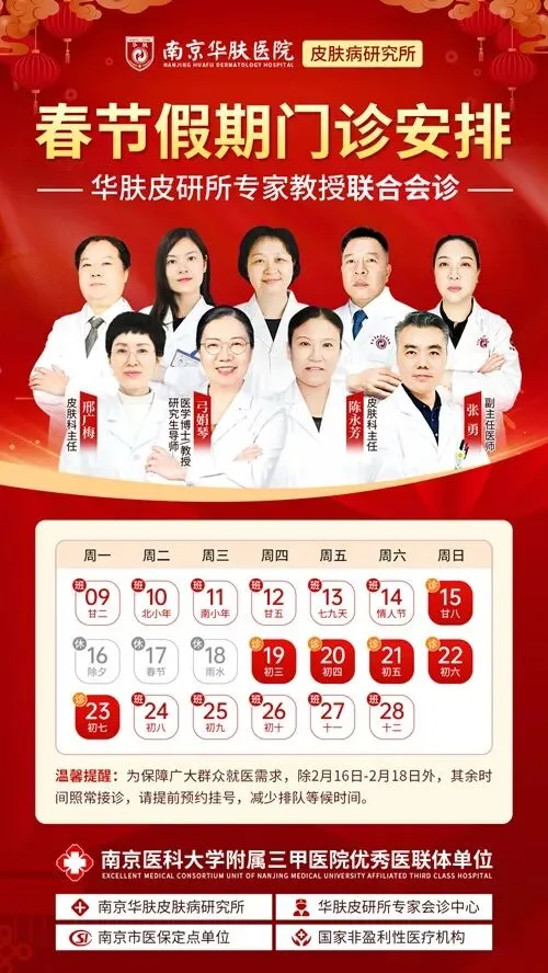 健康无假期:南京华肤皮肤病研究所春节接诊安排全公开。春节是阖家团圆的重要时刻,但皮肤问题却不会因假期而“放假”。为保障广大市民在春节期间的就医需求,南京华肤皮肤病研究所始终坚守医疗岗位,以“健康无假期”为服务理念,全力守护市民的皮肤健康。作为南京市医保定点单位,华肤皮研所不仅拥有专业的医疗资质,更以无假日门诊的服务承诺,成为市民春节期间就医的可靠选择。