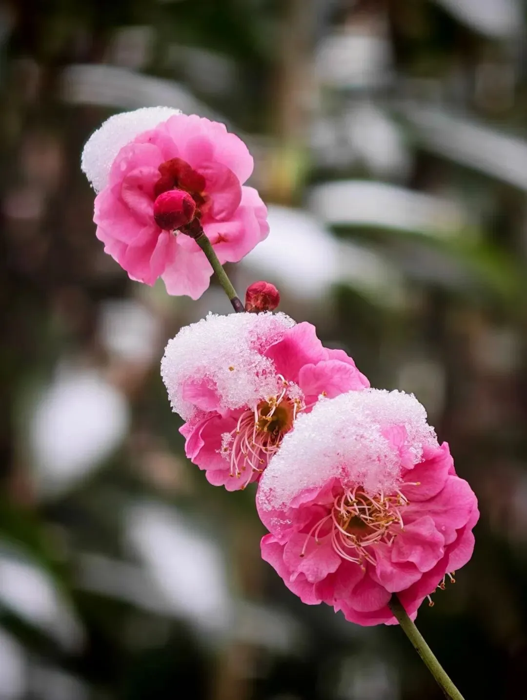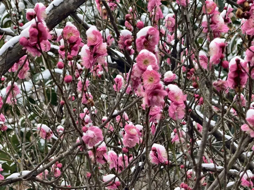 在山脚路边发现几株红梅、绿梅,几波人争先恐后拍摄雪中梅。