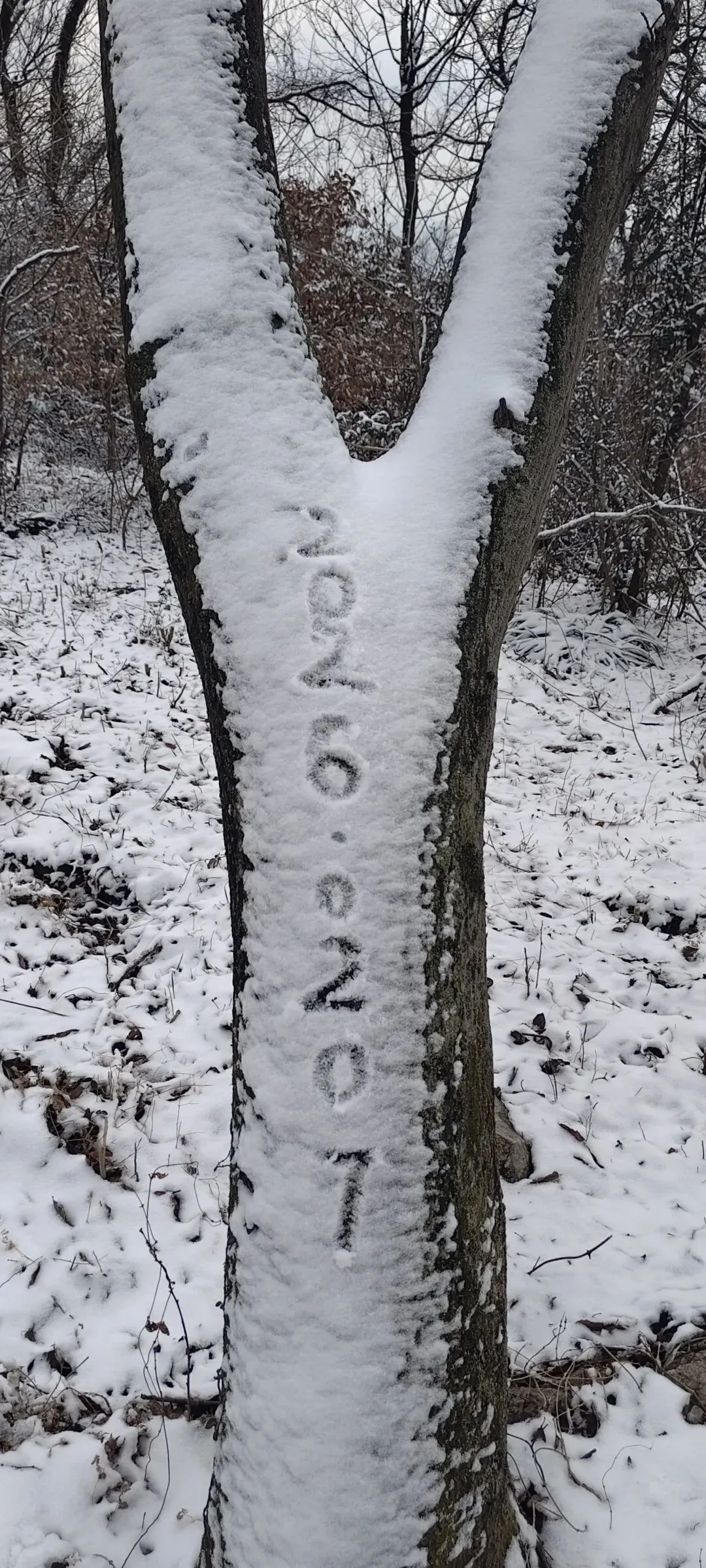 在山顶一棵树旁,不知是哪位游客在树身上写下了2026 02 07的日期,被九天发现,招呼我彼此拍照,结果引来另一群人呼啦啦围过来拍照。