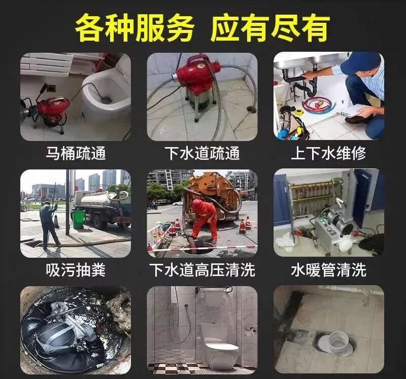 疏通下水道、马桶、蹲厕、地漏;疏通下水管;维修马桶漏水;维修水管;卫生间除臭、反味处理;脸盆、菜盆疏通;疏通墩布池;通坐便、蹲便、小便池;除尿碱;打捞贵重物品;疏通主管道、疑难管道、市政管道、工业管道;高压清洗车、抽粪车服务;上下水管安装、改管、维修。