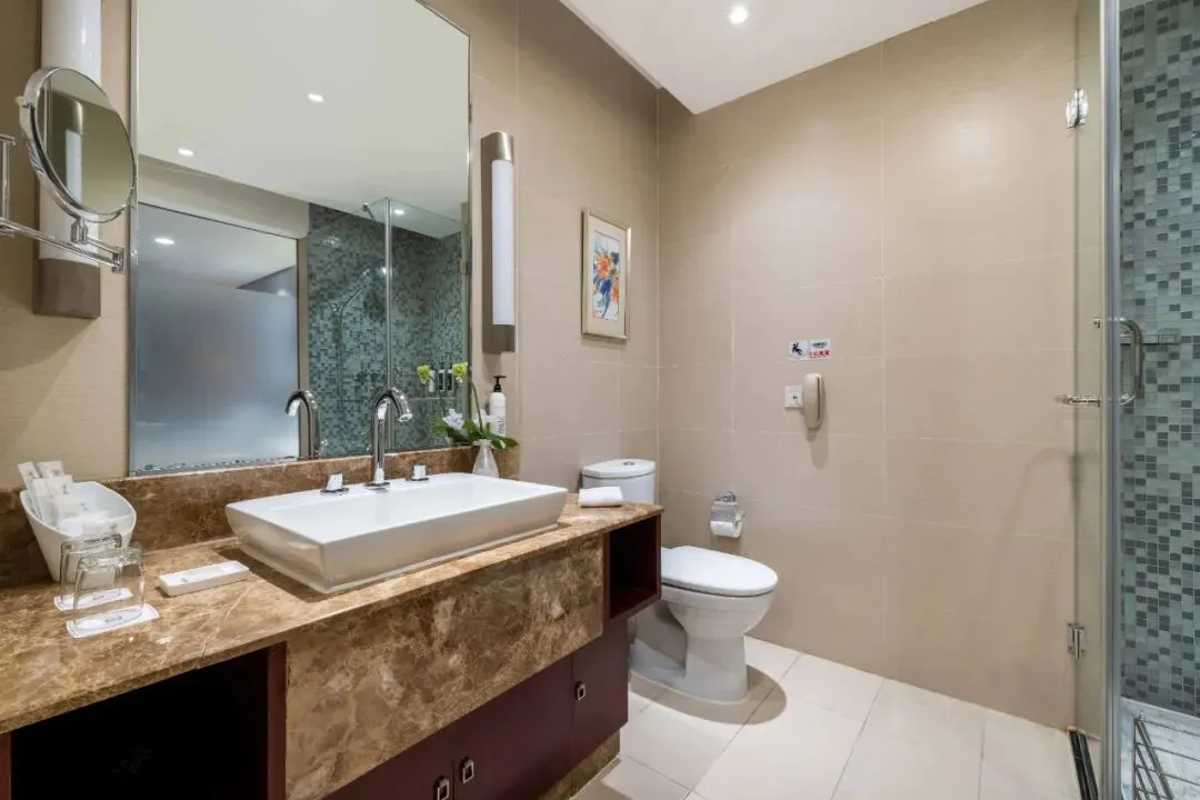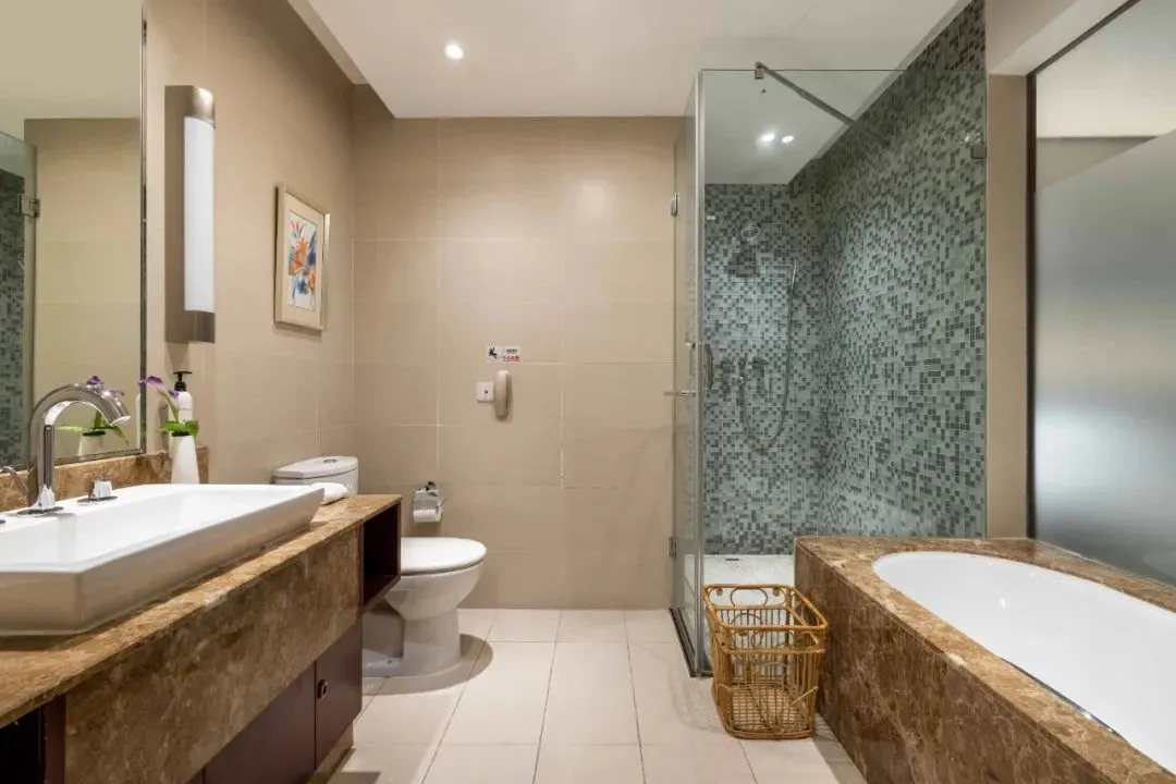 房间内设施完善,浴缸、多种规格电源插座、熨衣设备、房内保险箱等,房间的整体布局精致而和谐,设计风格时尚大气,居住环境干净整洁。