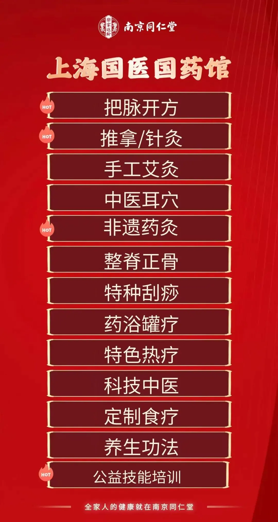 2021年,南京同仁堂收归国有,在上海徐汇区清真路23号设立南京同仁堂,医馆响应国家的号召,提倡“以养代医治未病”,致力于“医养结合一站式家庭健康管理”服务模式,是一家融合中医诊疗、中医理疗、养生食疗、生活习惯指导、健康管理为一体的综合型中医诊所。