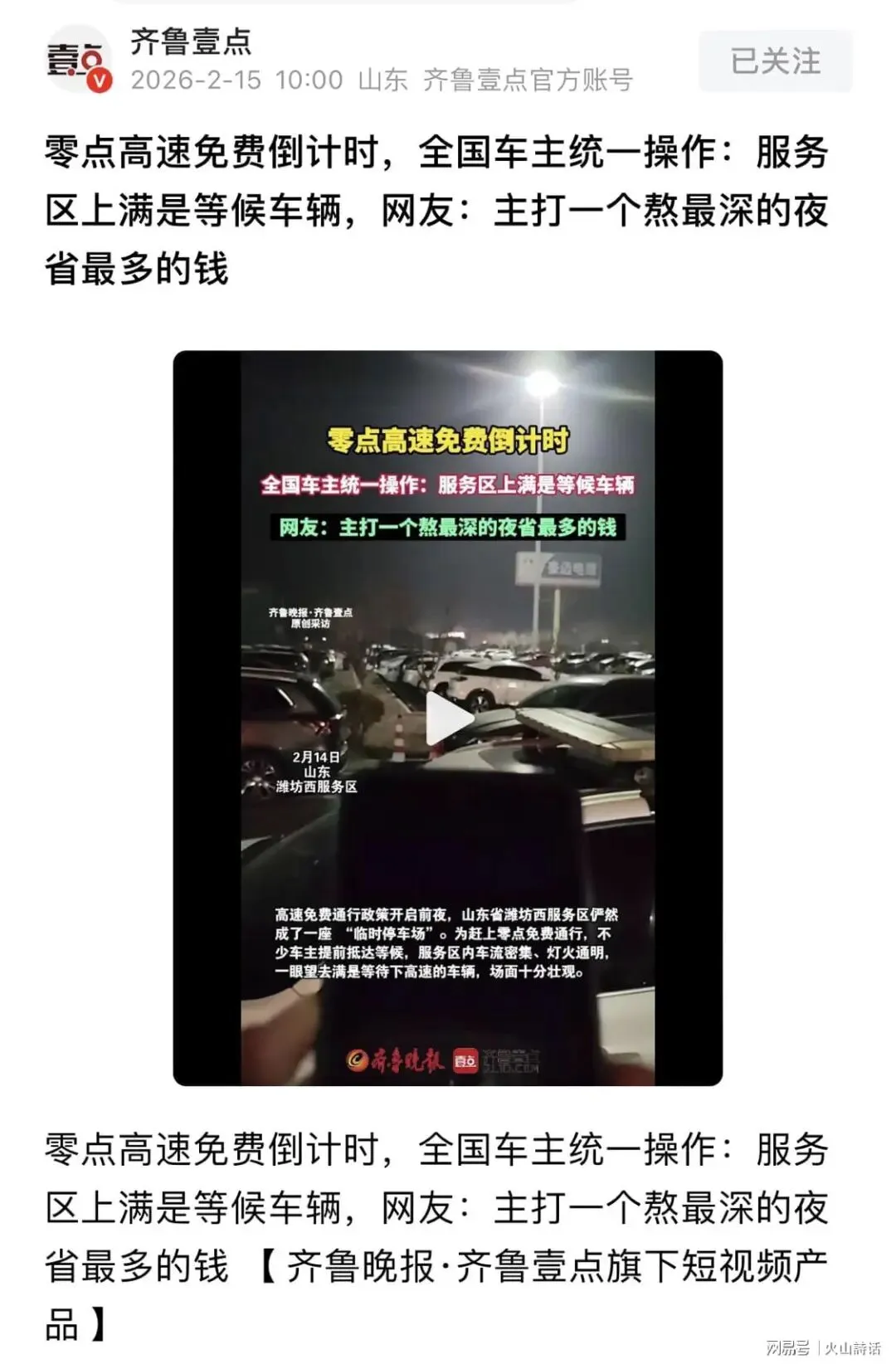 据多家媒体报道,临近免费起始零点,全国高速服务区及临近收费站早已车流如织、灯火通明——大量车主自发集结,在服务区“守夜待免”。网友笑称:“熬最深的夜,省最多的费。