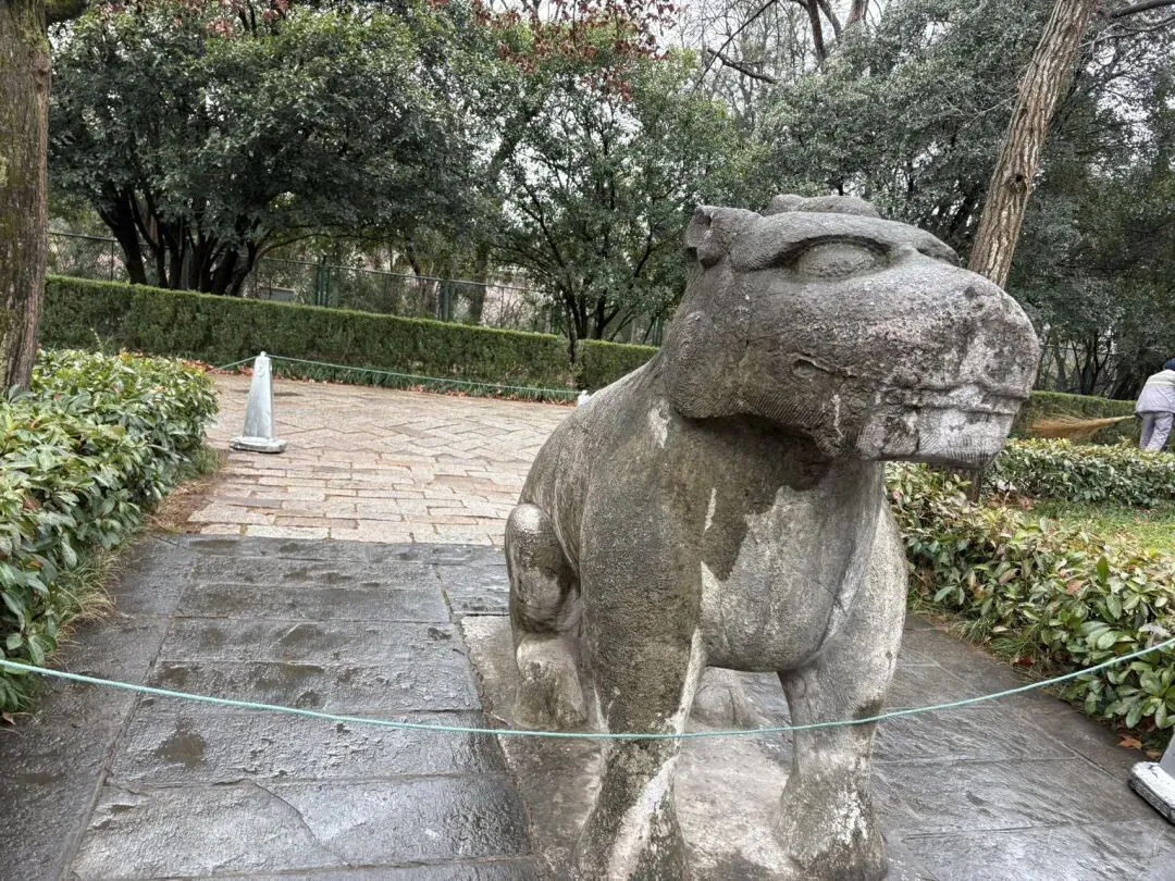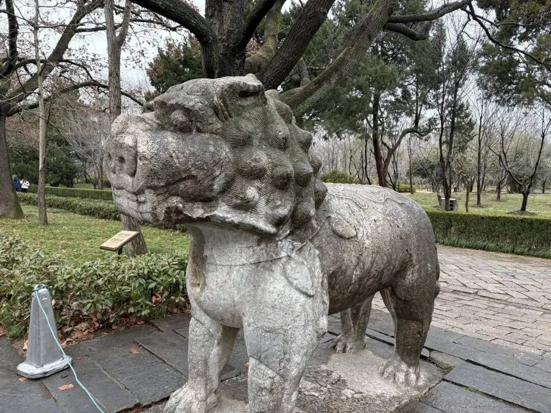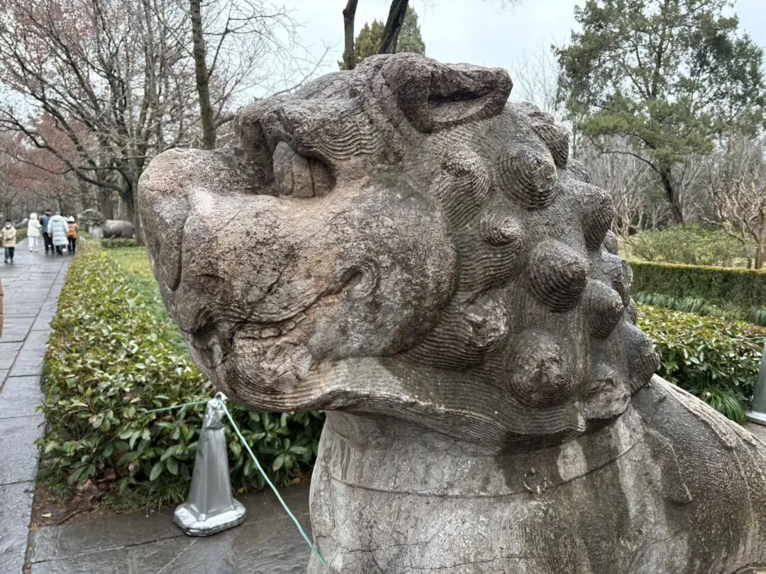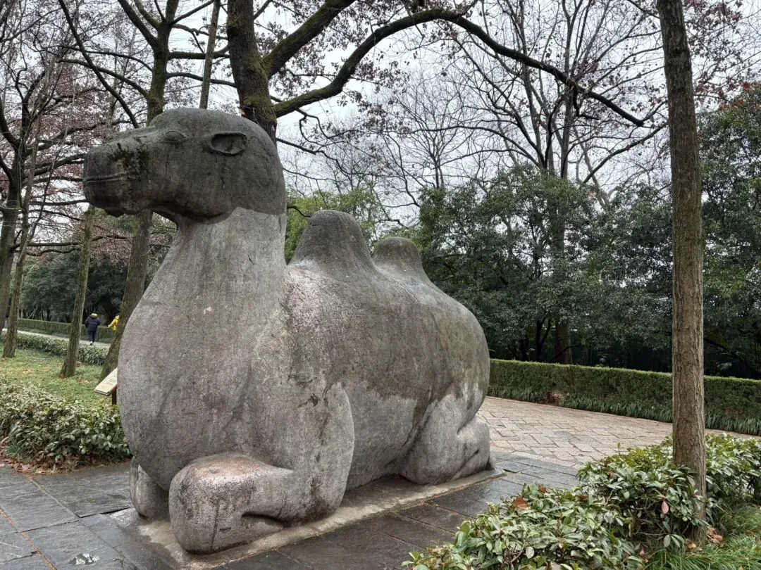 随后去了钟山风景区明孝陵。一路沿着神道走,石象路是孝陵神道的第一段,长615米,沿途依次排列狮、獬豸、骆驼、象、麒麟、马六种石兽。这些石兽用整块巨石采用圆雕技法刻成,线条流畅圆润,气魄宏大,风格粗犷,既标识着帝陵的崇高、圣洁、华美,也起着保卫、辟邪、礼仪的象征作用。