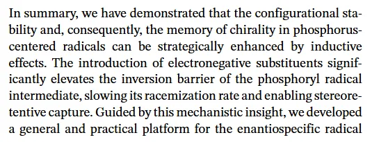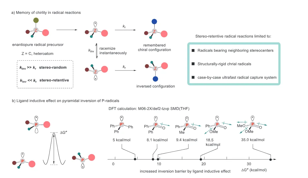 The realization of stereospecific radical reactions—particularly those involving heteroatom-centered radicals—remains aformidable challenge due to the rapid configurational inversion (racemization) of transient radical intermediates. This study presents a general strategy to enhance the memory of chirality (MOC) in radicals by exploiting the inductive effect of substituents. Through DFT calculations, we demonstrate that the pyramidal inversion barrier of phosphorus-centered radicals can be dramatically increased by substitution with highly electronegative atoms. This deceleration of inversion enables stereoretentive transformations of enantiopure H-phosphinates under mild, radical conditions. A series of stereospecificphosphoryl radical reactions, including alkene hydrophosphonylation, intramolecular arylphosphonylation, phosphorylation–cyclization of isocyanates, and aryl migration reactions, were successfully developed, providing access to diverse P(V)-stereogenic compounds with high efficiency (up to 99% yield) and excellent stereospecificity (up to >99% es). The utility of this approach is highlighted by the late-stage functionalization of densely functionalized pharmaceuticals, bioactive molecules, and a liquid crystal. This work establishes a foundational principle for achieving stereochemical control in radical reactions via rational tuning of theradical intermediate’s configurational stability.