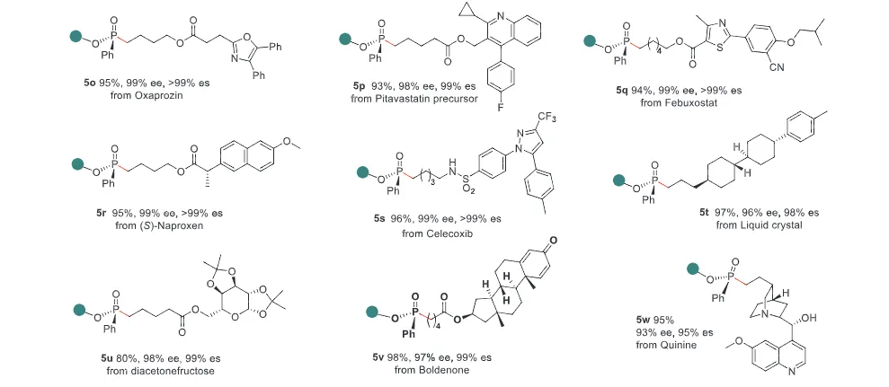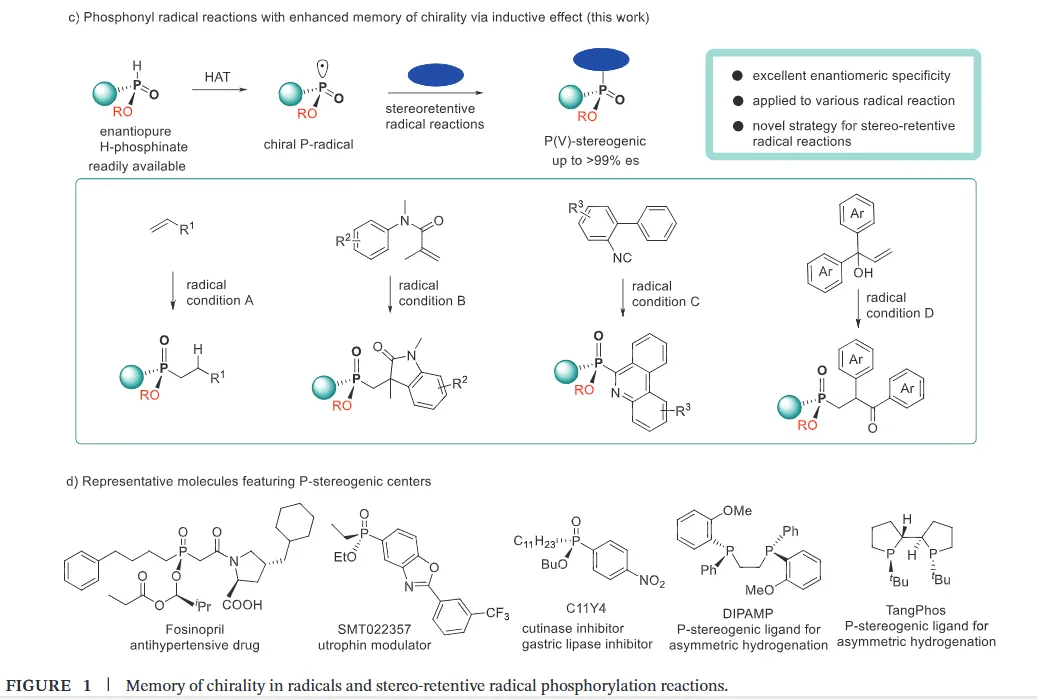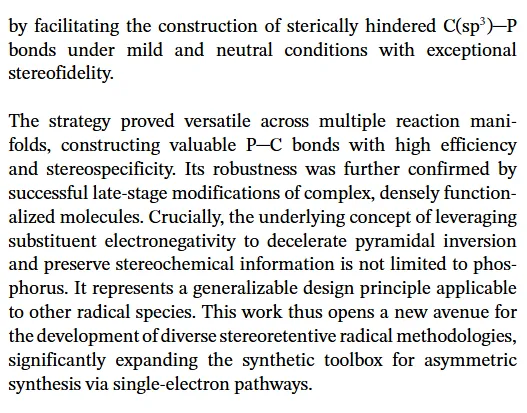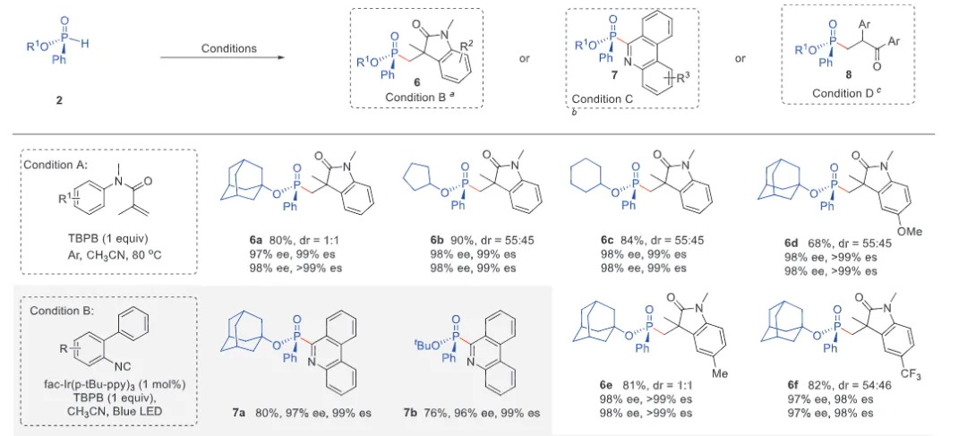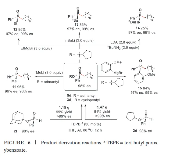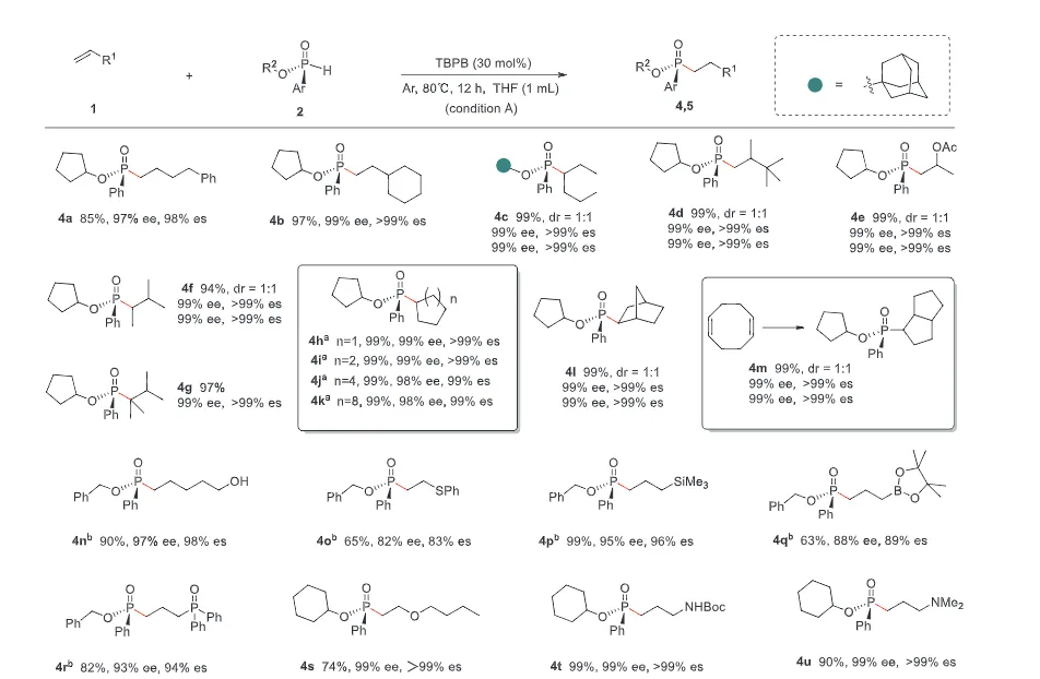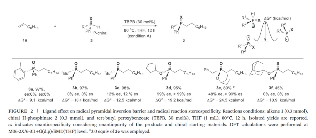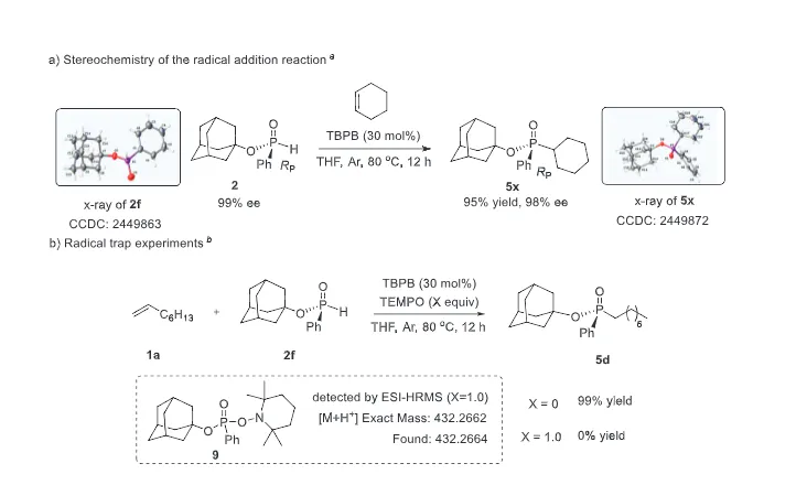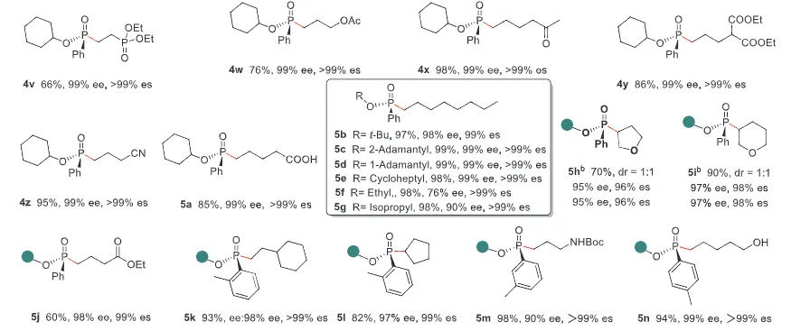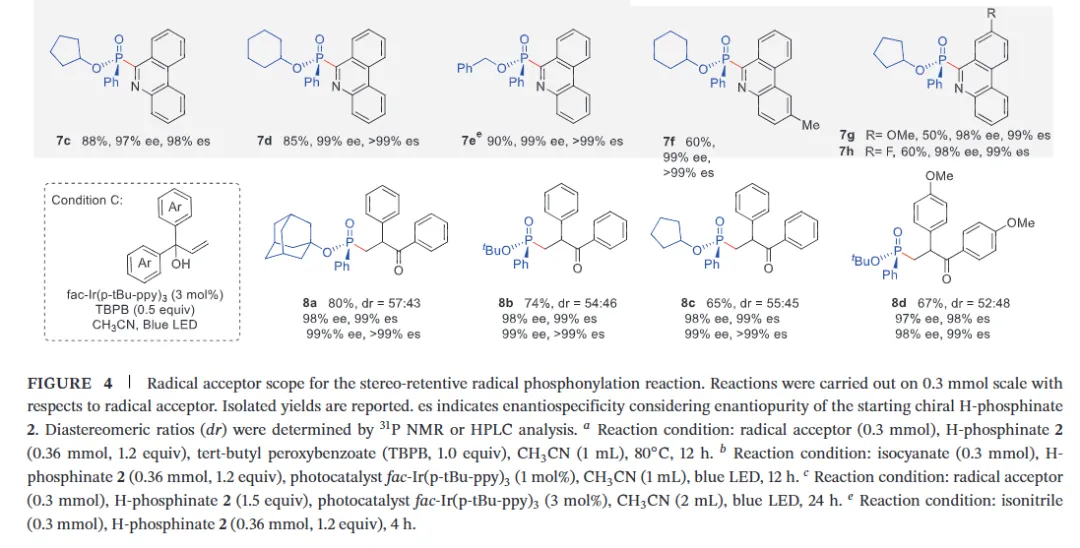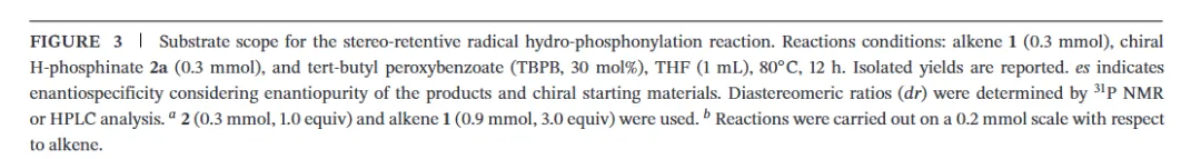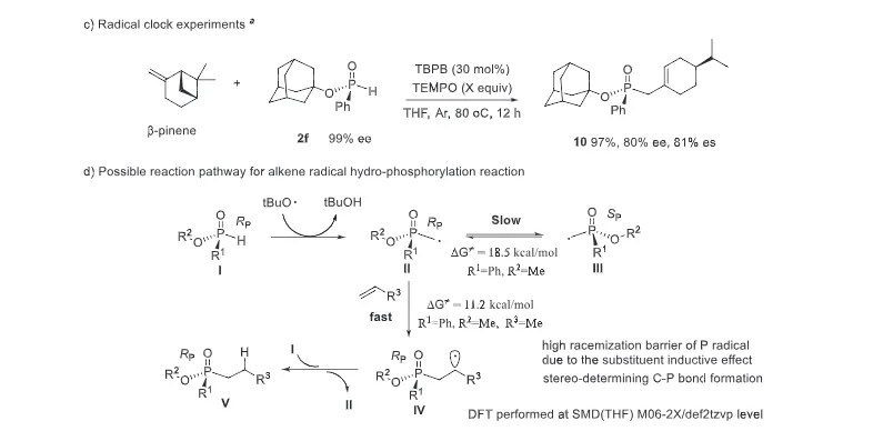 图2. 配体效应对自由基棱锥形反转能垒和自由基反应立体选择性影响(图片来源于ACIE)图3. 立体选择性保留的自由基氢膦酰化反应底物拓展(图片来源于ACIE)图4. 立体选择性保留的自由基膦酰化反应自由基受体底物拓展(图片来源于ACIE)图5. 机理研究及可能的反应机理(图片来源于ACIE)