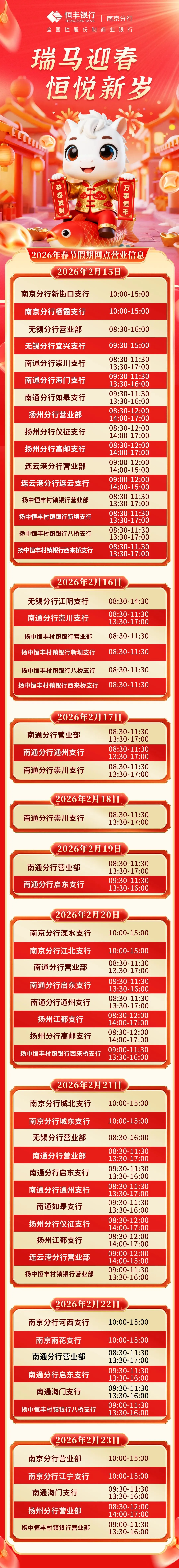 正值2026年新春佳节,根据国家法定节假日安排,我分行营业网点春节假期期间(2026年2月15日至2月23日)营业时间有所调整。为方便您办理业务,现将我分行营业网点营业期间对外营业时间安排公告如下: