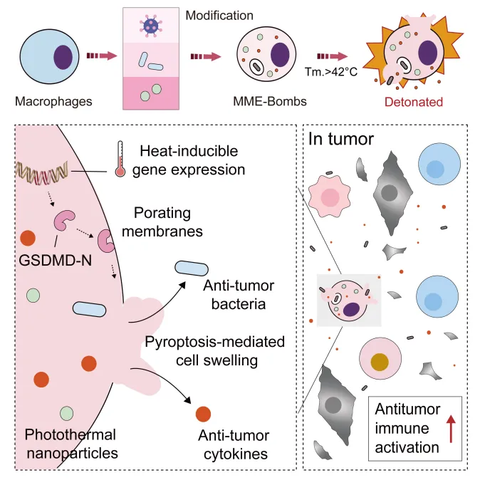 以巨噬细胞为基础的工程化疗法在癌症治疗领域展现出潜力,但仍面临若干关键限制:药物释放过程缓慢且难以控制,存在巨噬细胞被重编程为促癌表型的风险。此外,该类细胞的载药能力有限,为实现有效的抗肿瘤效果,常常需要输注大量工程化巨噬细胞(剂量可达108/kg)。这些因素共同制约了该疗法的进一步开发与临床转化。理想的细胞介导抗癌策略应具备可控性、易操作性以及持久疗效。与常规药物因时间推移而逐渐降解的特性不同,溶瘤细菌(如减毒鼠伤寒沙门氏菌)能够在肿瘤内部特异性增殖,并易于通过基因工程进行改造。同时,外源性细菌被认为可为巨噬细胞提供持续且强效的激活信号。因此,将巨噬细胞治疗与细菌疗法相结合,有望克服传统细胞疗法所面临的诸多挑战,为肿瘤治疗提供新的可行路径。南京大学华子春/吴乐阳团队发现细菌 HtrA 蛋白是其抗癌关键效应蛋白,细菌可诱导瘤内巨噬细胞焦亡进行抗癌治疗。并开发出多个具有自主知识产权的溶瘤菌株,部分菌株已获准开展研究者发起的临床研究。团队进一步聚焦于细菌药物的智能精准递送新策略,基于溶瘤细菌与巨噬细胞的天然相互关系,开创“细胞-细菌-抗体”一体化的免疫细胞创新药物,实现对原位乳腺癌、黑色素瘤等肿瘤的精准瘤内药物释放。该策略有效避免了细菌药物大量暴露所带来的安全隐患。然而,如何实现巨噬细胞对装载细菌在瘤内的可控释放,以及阐明此类一体化细胞药物的抗癌机制,仍是当前面临的关键挑战。近日,南京大学华子春教授、吴乐阳研究员联合南京大学附属鼓楼医院徐运教授,在 Cell Reports上发表了题为“Controlled pyroptosis of engineered macrophages enables biphasic antitumor via the release of oncolytic bacteria and inflammatory signals”的研究论文。该研究创新性地构建了一种热诱导巨噬细胞自溶解系统,并据此开发了用于肿瘤治疗的“巨噬细胞-微生物封装炸弹”(MME-Bomb)。MME-Bomb 是一种装载吲哚菁绿纳米颗粒与新型减毒沙门氏菌株的工程化巨噬细胞载体,能通过光控技术精确调控抗肿瘤反应,为临床精准免疫治疗的设计提供了新的技术路径。为构建热诱导自溶型巨噬细胞,研究团队首先设计了一套合成的热响应基因回路,该回路由热休克蛋白启动子(pHSP)与细胞焦亡效应蛋白 Gasdermin D 的 N 端结构域(GSDMD-N)组成。GSDMD-N 可诱导细胞膜穿孔,进而引起细胞焦亡性裂解与内容物释放。随后,研究人员在工程化巨噬细胞内共装载光敏剂吲哚菁绿(ICG)及耐热型减毒沙门氏菌株 DLV。在近红外光照射下,ICG 将光能转化为热能,触发巨噬细胞发生可控的焦亡并裂解,从而实现对其胞内细菌的精准、快速释放。实验结果表明,基于该焦亡机制的细胞裂解使细菌释放效率提升8.3倍,同时伴随大量促炎细胞因子的迅速释放。瘤内释放的细菌能够快速增殖,并与急剧升高的促炎细胞因子协同作用,强力激活肿瘤局部免疫应答,最终实现了 MME-Bomb 的稳定、持久、精准抗癌。在多种临床前肿瘤模型中,MME-Bomb 均显著降低了小鼠的肿瘤负荷,并延长了荷瘤小鼠的生存周期。总之,本研究成功开发了一种光热调控的一体化细胞抗癌(MME-Bomb)策略。单次注射 MME-Bomb 即可产生强大而持久的抗肿瘤疗效,有望突破传统细胞疗法的关键局限,为肿瘤治疗开辟具有转化潜力的新方向。https://www.sciencedirect.com/science/article/pii/S2211124725016900#abs0020