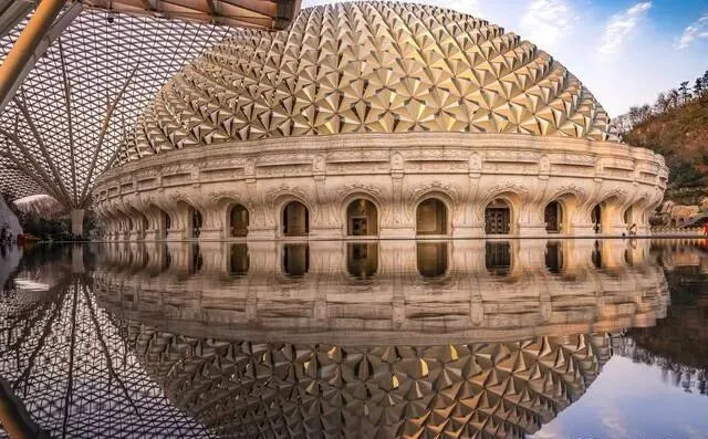 大穹顶下面有个水塘 , 风平浪静的时候倒影完美对称 , 随手一拍就是大片。 旁边佛顶塔可以登顶 , 俯瞰整个金陵 , 值回票价!