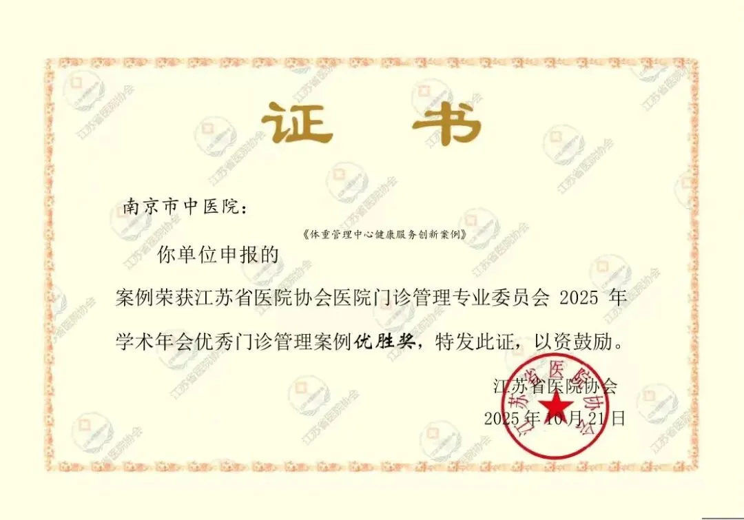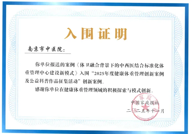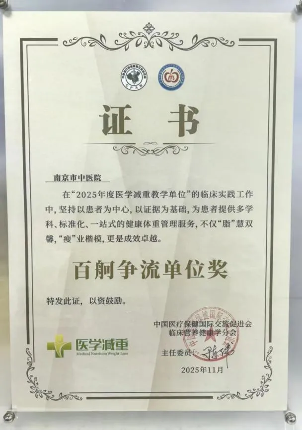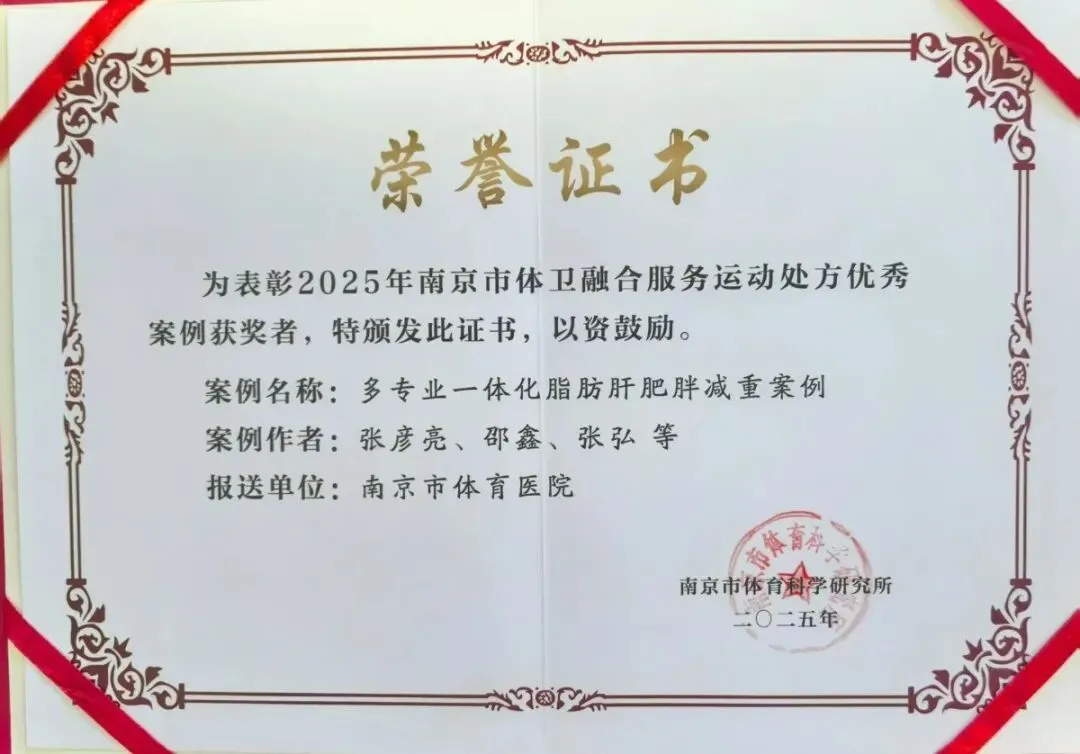2025年度江苏省减重减脂比赛南京赛区公布了评选结果,南京市中医院(南京市体育医院)体重管理中心选送的6位参赛选手凭借优异成绩,荣获“减重减脂优胜奖”。同时体育医院团队创作的科普视频《好汉也怕胖》荣获优秀科普视频类作品一等奖。此外我院体重管理中心团队也同时承担了此次比赛南京赛区的技术指导和培训工作,充分展现了我院在体重管理方面的专业实力,为推动全市健康体重管理事业树立了优秀典范。