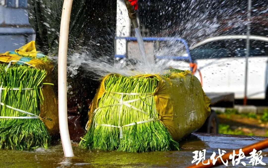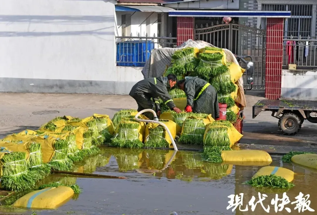 鲍献金一边给芦蒿袋割口排水,一边说道:“母亲和孩子已经先回老家过年了,我和父亲再守几天,把春节的货备足再返程。”鲍献金说,孩子从小闻得最多的就是芦蒿味,如今他们把家安在了六合,这根芦蒿,就是他们牵挂的家的味道。