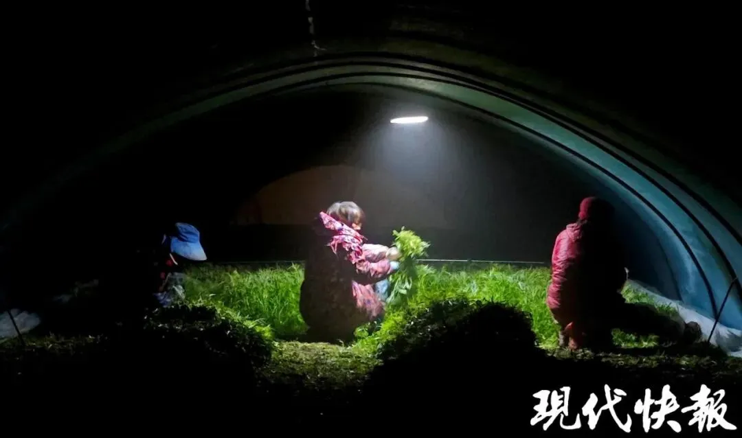 2月12日凌晨4点,夜色正浓,一弯弯月挂在天边。城市还在沉睡,南京八卦洲的芦蒿大棚里灯火点点。“哗啦”一声,现代快报记者掀开大棚的塑料布一角,带着江水湿气的寒气扑面而来,来自安徽的吴素梅、罗小、尹美娥三位大姐却毫不在意,指尖在茎叶间飞快翻飞,镰刀起落间,一捆捆鲜嫩的芦蒿便整齐码放成小山。“年前多干点,多挣点钱,回家过个踏实年。”从凌晨到正午,大棚里的灯火就没灭过,镰刀起落声、说笑声、捆绳声,合成一首丰收的序曲。
