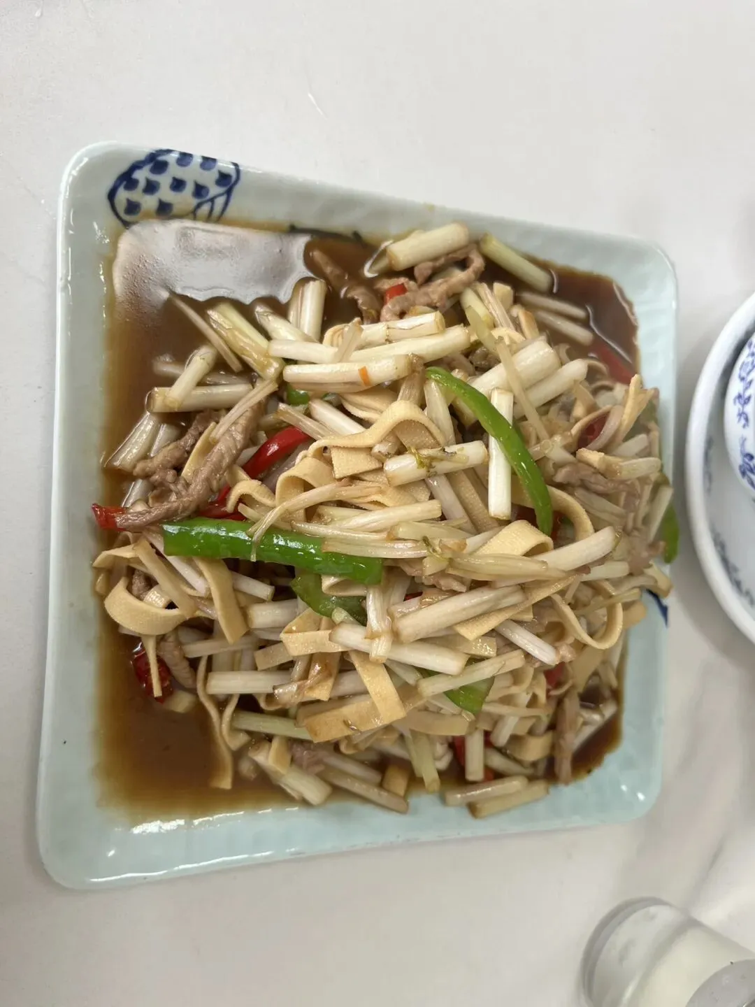 过便民河桥后又走了一个路口后右拐穿村到长江村上厕所,然后找地吃饭,一个家常菜馆点了没吃过的白芹,说可以炒肉或百叶,就让都放了点