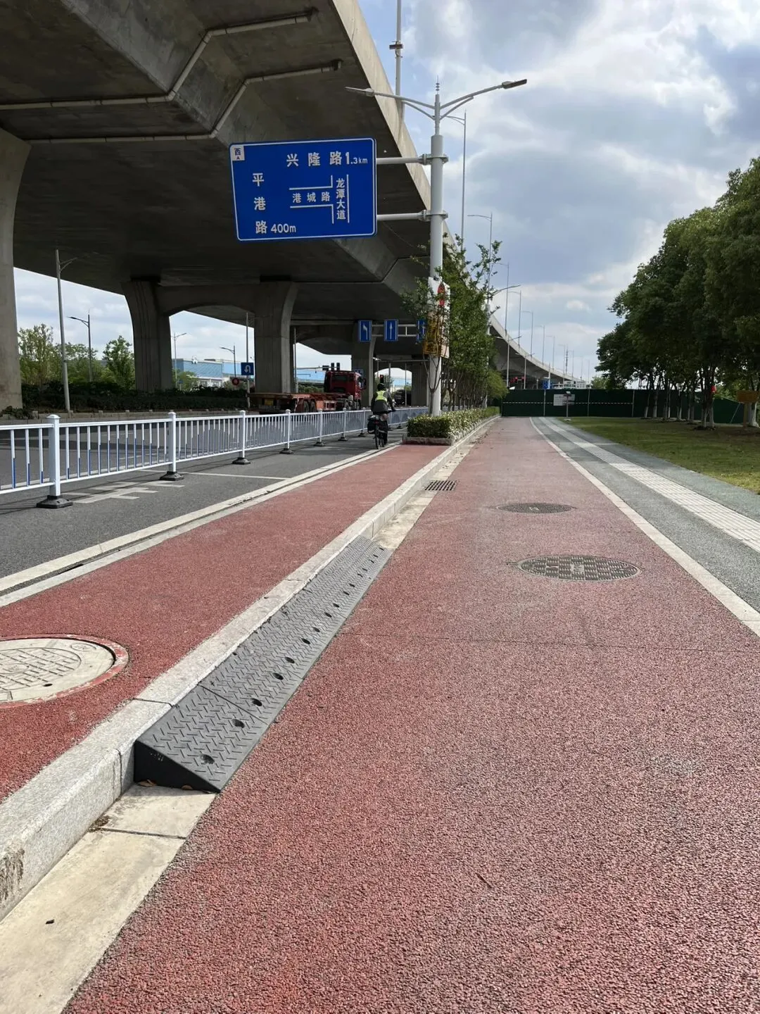 在这遇到非机动车道施工封闭,给搭了坡,还用栏杆隔了半条机动车道给非机动车,很人性化的操作