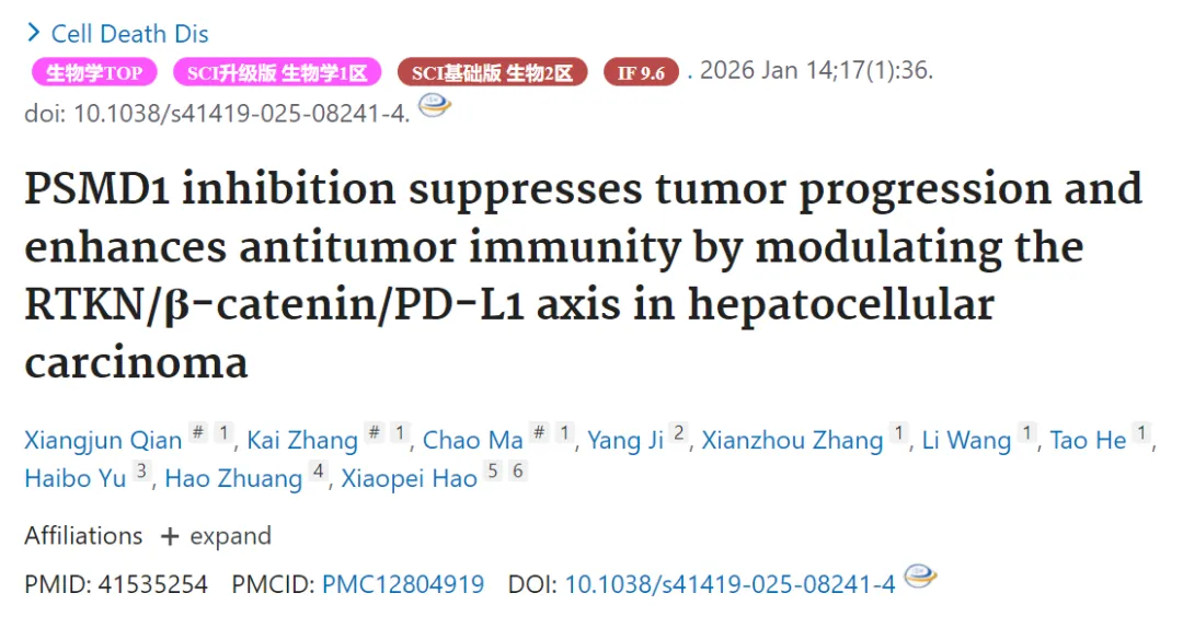 中文标题:PSMD1抑制通过调节肝细胞癌中的RTKN/β-连环蛋白/PD-L1轴,抑制肿瘤进展并增强抗肿瘤免疫