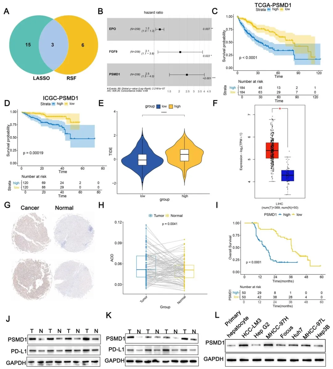 TCGA、ICGC 数据库分析显示,HCC 组织中 PSMD1 mRNA 水平显著高于癌旁组织(图 1F),免疫组化及 Western blot 验证其蛋白高表达(图 1G-K)。高表达 PSMD1 与肿瘤大尺寸、高 TNM 分期、高 Edmondson 分级相关(表 1),且患者总生存期更短(图 1I),TIDE 评分提示免疫治疗应答更差(图 1E)。