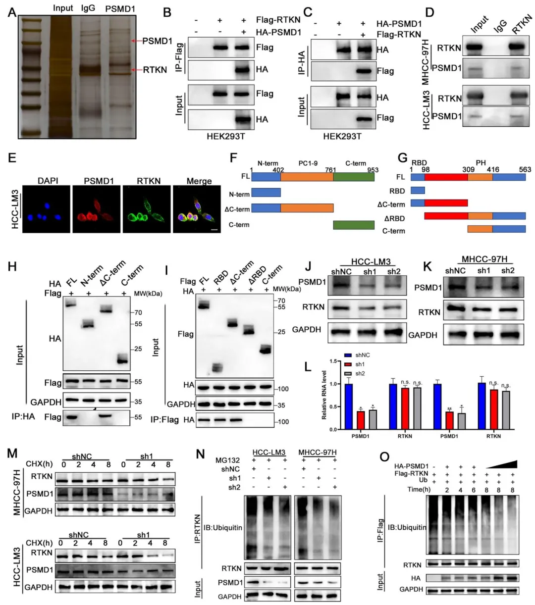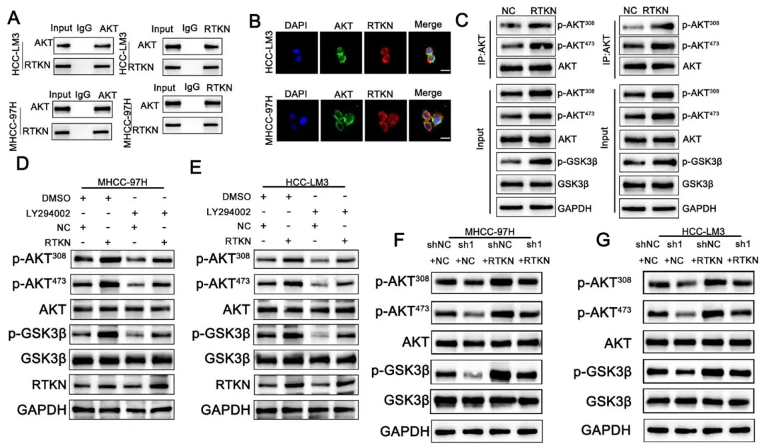scRNA-seq 数据分析显示 PSMD1 与 β-catenin 通路正相关(图 4A),敲低 PSMD1 可降低 β-catenin 蛋白水平及下游靶基因(CyclinD1、c-Myc 等)表达,减少 PD-L1 转录(图 4B-F)。Co-IP 及质谱鉴定 PSMD1 与 RTKN 互作,通过抑制其泛素化稳定 RTKN 蛋白(图 5A-N)。RTKN 可结合 AKT 并促进其磷酸化,进而激活 β-catenin 通路(图 6A-G)。