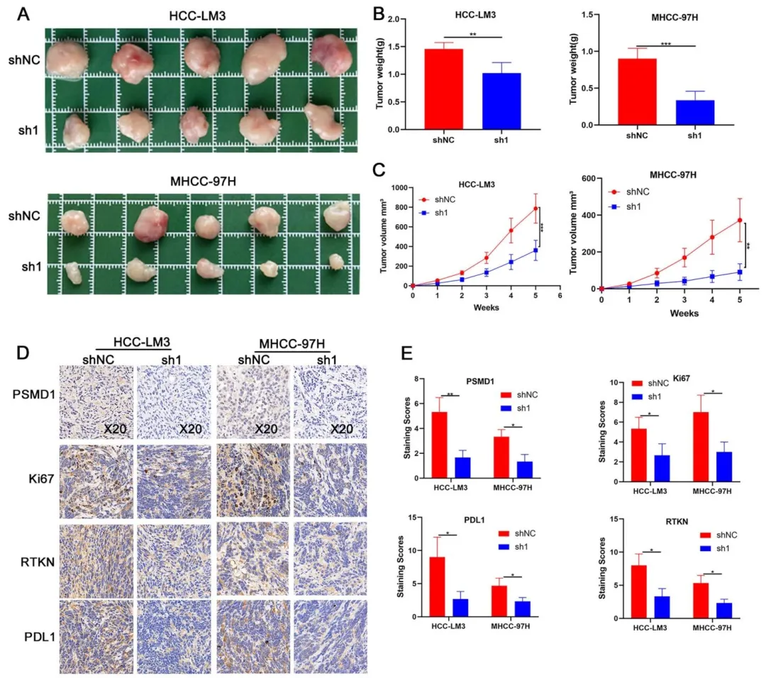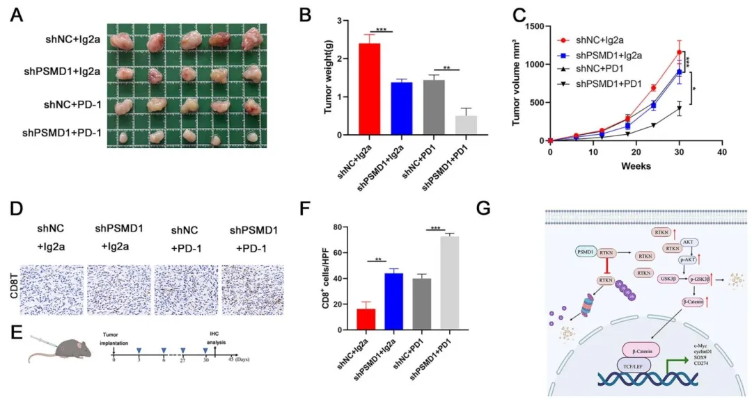 裸鼠皮下移植瘤模型中,PSMD1 敲低组肿瘤体积和重量显著减小,Ki67、RTKN、PD-L1 表达降低(图 7A-E)。原位瘤模型显示,PSMD1 敲低与抗 PD-1 治疗联合使用时,肿瘤抑制效果最显著,CD8⁺T 细胞浸润增加(图 8A-F),证实 PSMD1 敲低可增强免疫治疗敏感性。