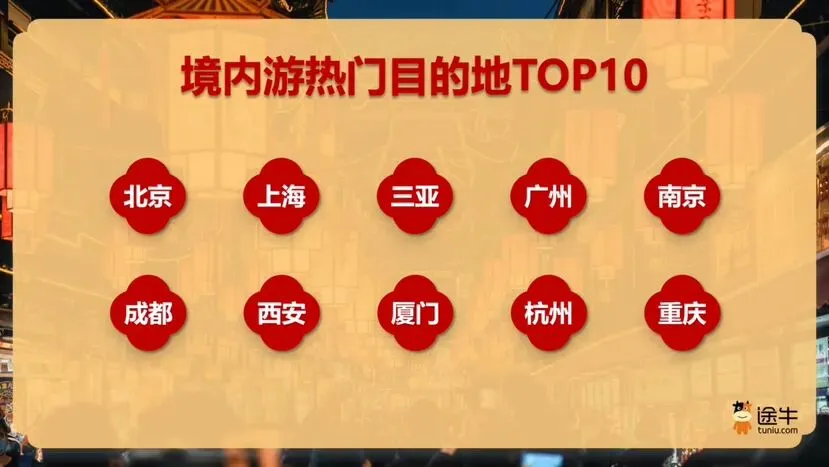 2月15日,途牛最新预订数据显示,南京位列春节假期首日境内游热门目的地TOP5、境内自驾游热门目的地TOP8、酒店预订热门城市TOP9。