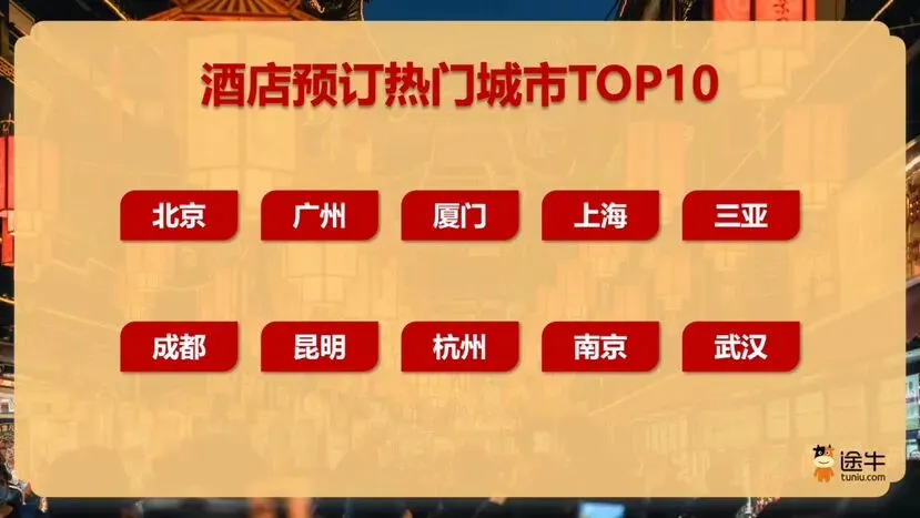 酒店预订方面,北京、广州、厦门、上海、三亚、成都、昆明、杭州、南京、武汉等目的地预订热度位居前列。