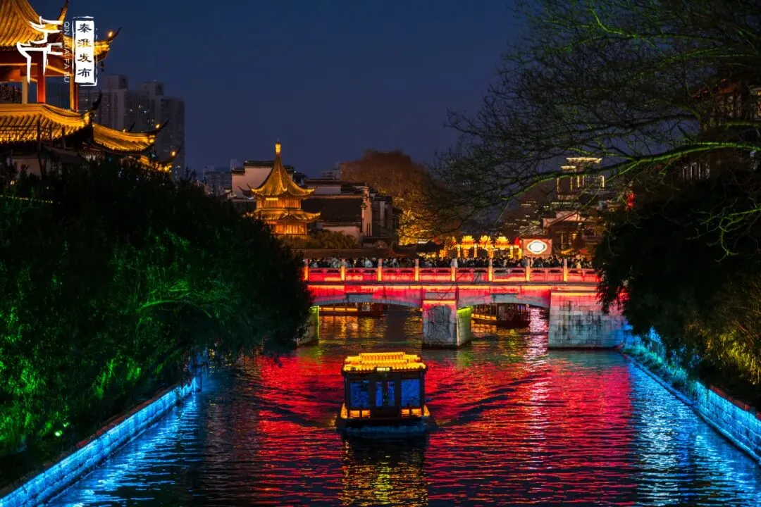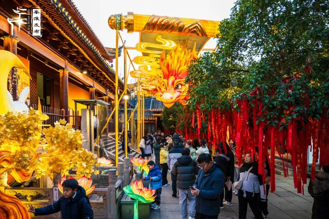 华灯初上,随着夫子庙景区的灯彩陆续点亮,秦淮河两岸流光溢彩、如梦似幻。