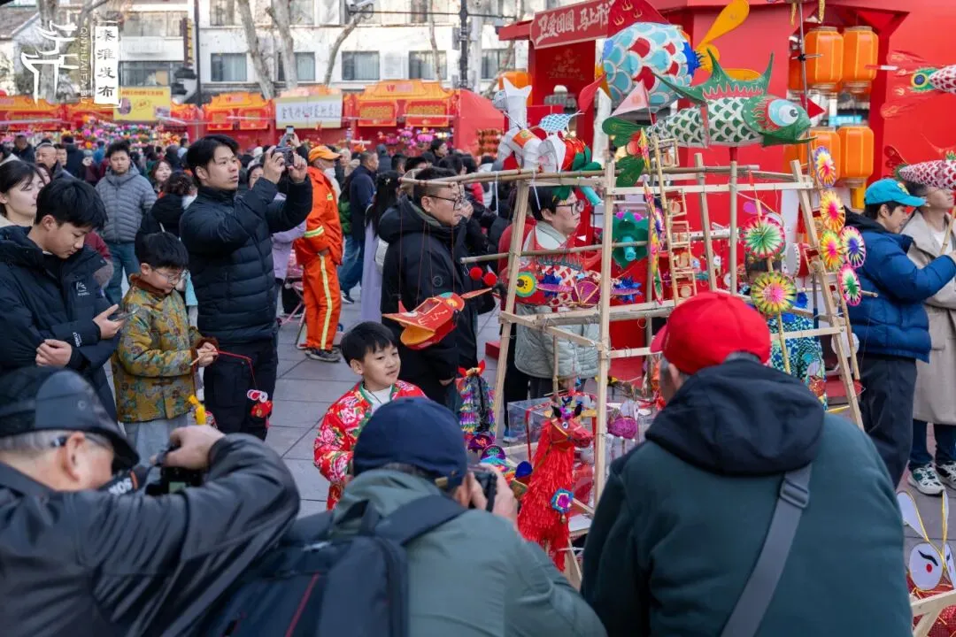 今年秦淮灯市从传统东牌楼整体西迁至瞻园路,地点虽变,热度不减。现场汇聚五十多位花灯艺人与传承老手艺人,坚守纯手工扎制技艺。