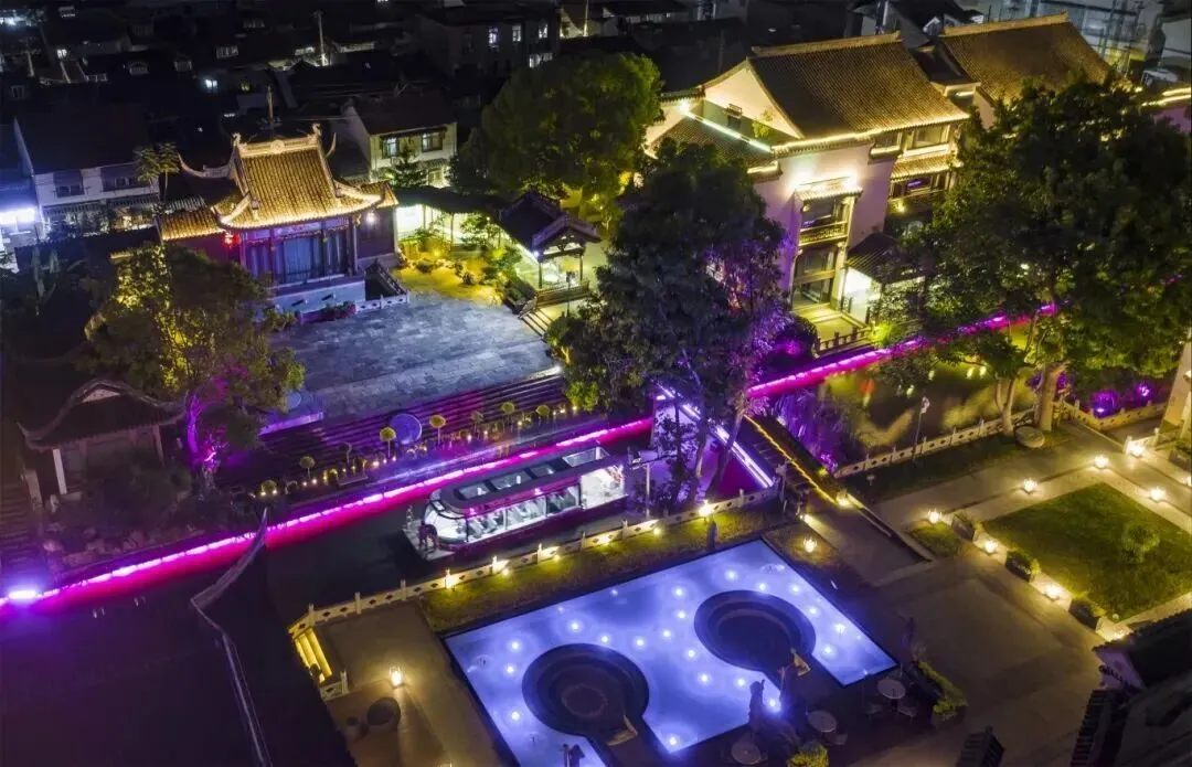 西五华里游线自泮池、中华门码头至西水关闸段,是一条集科技、艺术、历史相融的光影灯光秀沉浸式夜游线路,通过光影、造景、真人演艺等综合手法,将游船以穿越的形式驶入《南都繁会图》《上元灯彩图》等历史画卷中,游客、游船成为画卷的一分子,达到“船在画中游”的沉浸式效果。