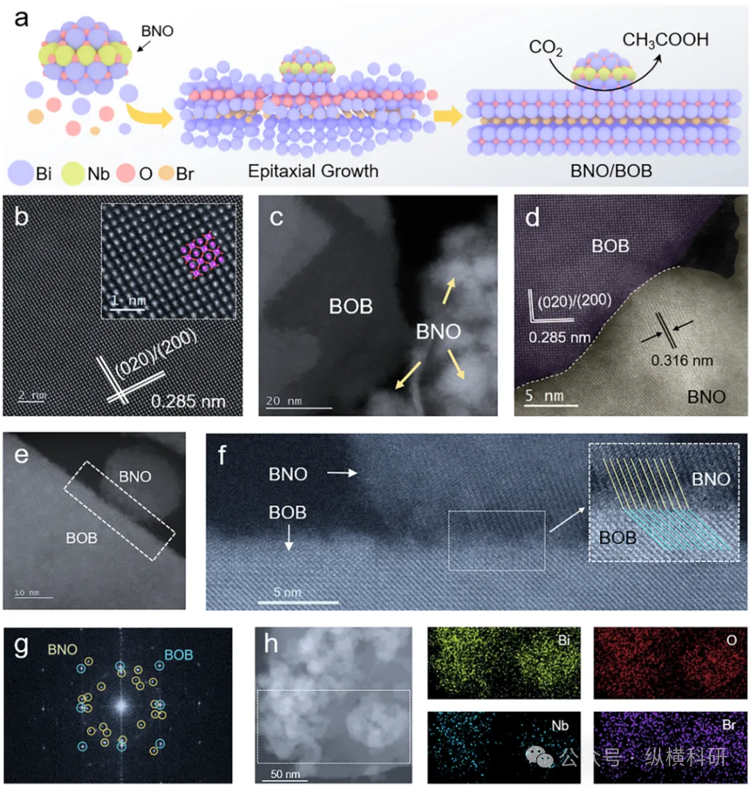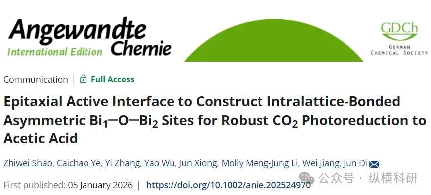 构建外延活性界面以形成晶格内键合的不对称Bi1─O─Bi2位点,实现二氧化碳高效光还原制乙酸https://doi.org/10.1002/anie.202524970太阳能驱动下由二氧化碳(CO₂)选择性合成C₂化学品是碳循环的关键途径,但受制于C─C偶联反应的高动力学能垒。本研究提出了一种晶格键合不对称位点的外延生长策略,通过在Bi₃NbO₇纳米点/Bi₃O₄Br纳米片(BNO/BOB)界面构建Bi₁─O─Bi₂位点,促进C─C偶联以实现乙酸生成。该体系下CO₂光催化转化为乙酸的速率可达192.3 µmol·g⁻¹·h⁻¹,选择性达91.4%,380 nm和400 nm处的表观量子效率分别达9.49%和6.57%。其核心机制源于界面Bi₁─O─Bi₂位点触发的级联电子效应:界面电荷再分布诱导强内建电场,高能电子选择性占据CO中间体的2π反键轨道,显著削弱CO中间体中的C─O键;同时,不对称电荷再分布有效中和相邻CO中间体间的静电排斥,通过Bi位点的d-π电子反馈协同稳定OCCO过渡态。双效应协同降低了C─C偶联与加氢步骤的能垒,最终驱动反应路径向高稳定性乙酸生成方向进行。乙酸(CH₃COOH)是化学制造、食品加工和制药等行业广泛使用的重要化学品。2023年,全球乙酸需求量约达1927万吨,受生产需求增长的推动,预计到2030年将增至2360万吨。目前,甲醇羰基化法是乙酸合成的主导工艺,占全球产量的60%以上。然而,该工艺需高温高压条件,导致能耗显著。随着对能源消耗和环境影响的关注日益加剧,利用可再生资源开发可持续的CH₃COOH生产方法的需求愈发迫切。近期研究表明,太阳能驱动二氧化碳还原制乙酸可实现精细化学品的可持续生产,同时将温室气体转化为高附加值产品。该路径为环境友好型可持续化学制造提供了极具前景的方案。为推进该技术发展,开发能够促进二氧化碳光还原制乙酸的新型高效催化剂至关重要。