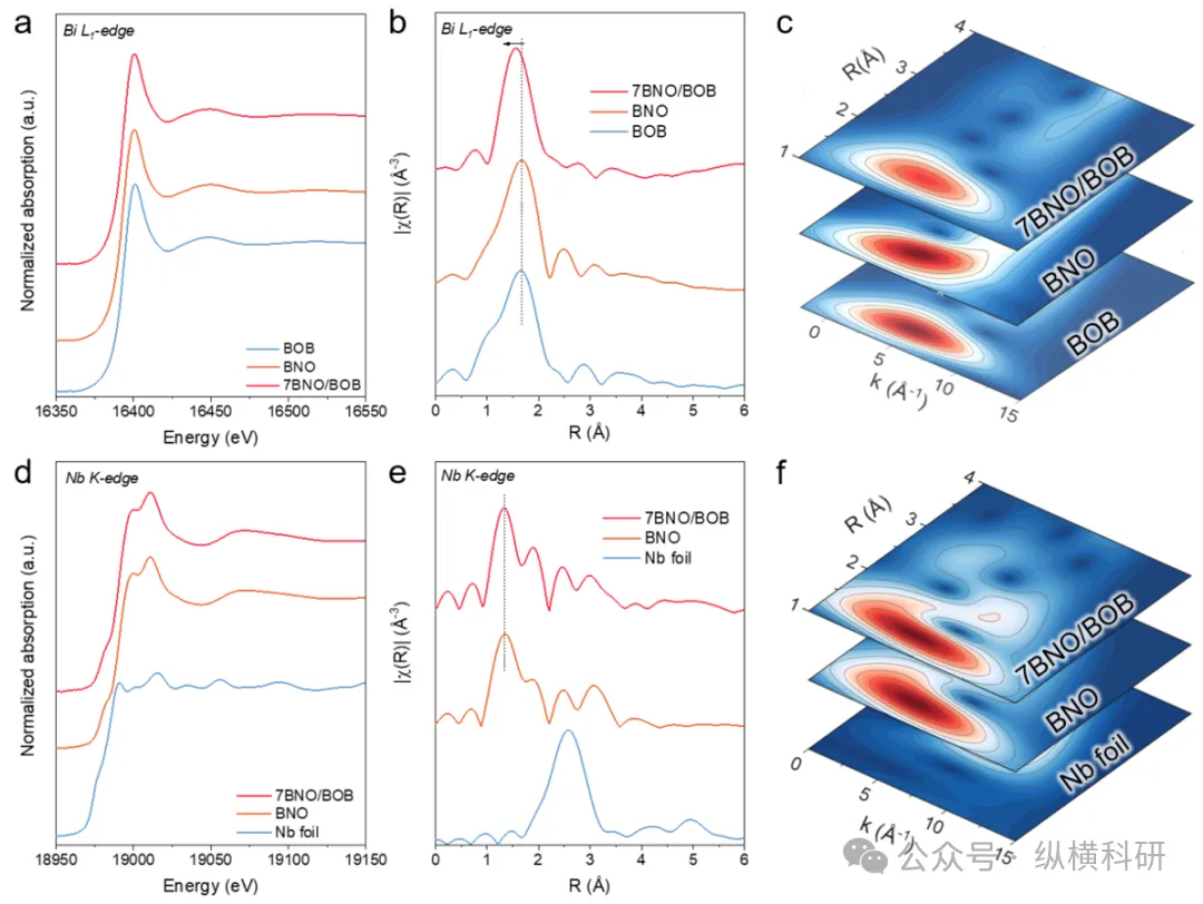 图2 BOB、BNO和7BNO/BOB在(a) Bi L₁边和(d) Nb K边的同步辐射X射线吸收精细结构(XAFS)光谱;BOB、BNO和7BNO/BOB在(b) Bi L₁边和(e) Nb K边的扩展X射线吸收精细结构(EXAFS)光谱;(c, f) 小波变换图。
