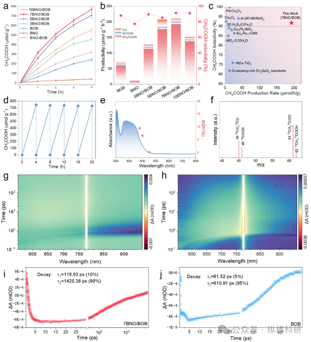 图3 (a) BNO、BOB、BNO/BOB和BNO - BOB光催化二氧化碳还原为乙酸的性能(误差棒代表至少三次独立实验的标准偏差);(b) BNO、BOB和BNO/BOB催化二氧化碳还原为乙酸的选择性;(c) 二氧化碳还原光催化剂的性能对比;(d) 7BNO/BOB催化二氧化碳还原的循环测试;(e) 7BNO/BOB的表观量子效率(AQE);(f) 7BNO/BOB催化¹³CO₂还原后产物的质谱图;(g) 7BNO/BOB的二维伪彩色瞬态吸收(TA)图;(h) BOB的二维伪彩色瞬态吸收(TA)图;(i) 7BNO/BOB的瞬态吸收衰减动力学;(j) BOB的瞬态吸收衰减动力学。
